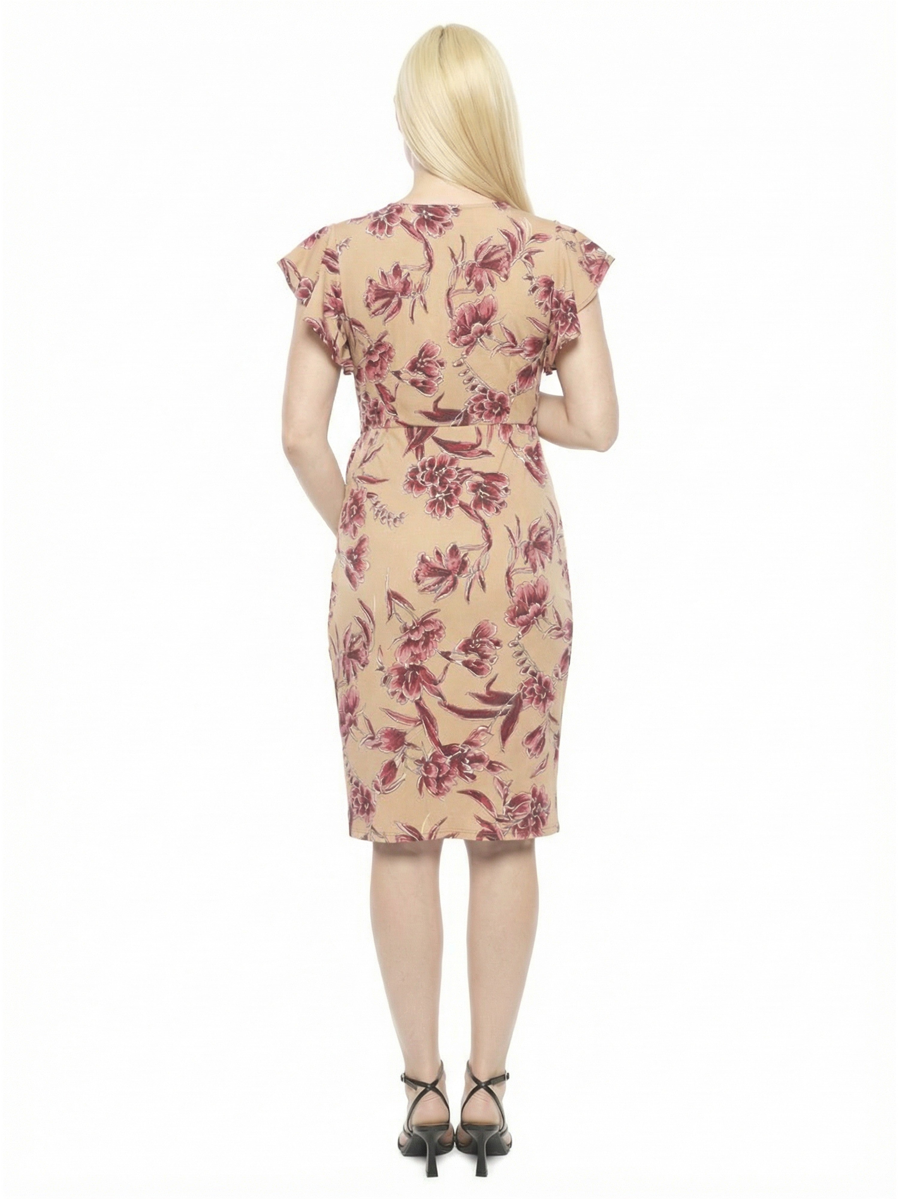 Add feminine charm and effortless elegance to your wardrobe with this maternity beige floral print faux wrap dress from 24seven Comfort Apparel. Featuring a flattering faux wrap silhouette, flutter sleeves for graceful movement, and a delicate red floral pattern on a soft beige background, it makes a subtle yet stylish statement. Cut at midi length with a figure-enhancing fit, it is crafted from soft, stretchy polyester blend and is machine washable for easy care.
