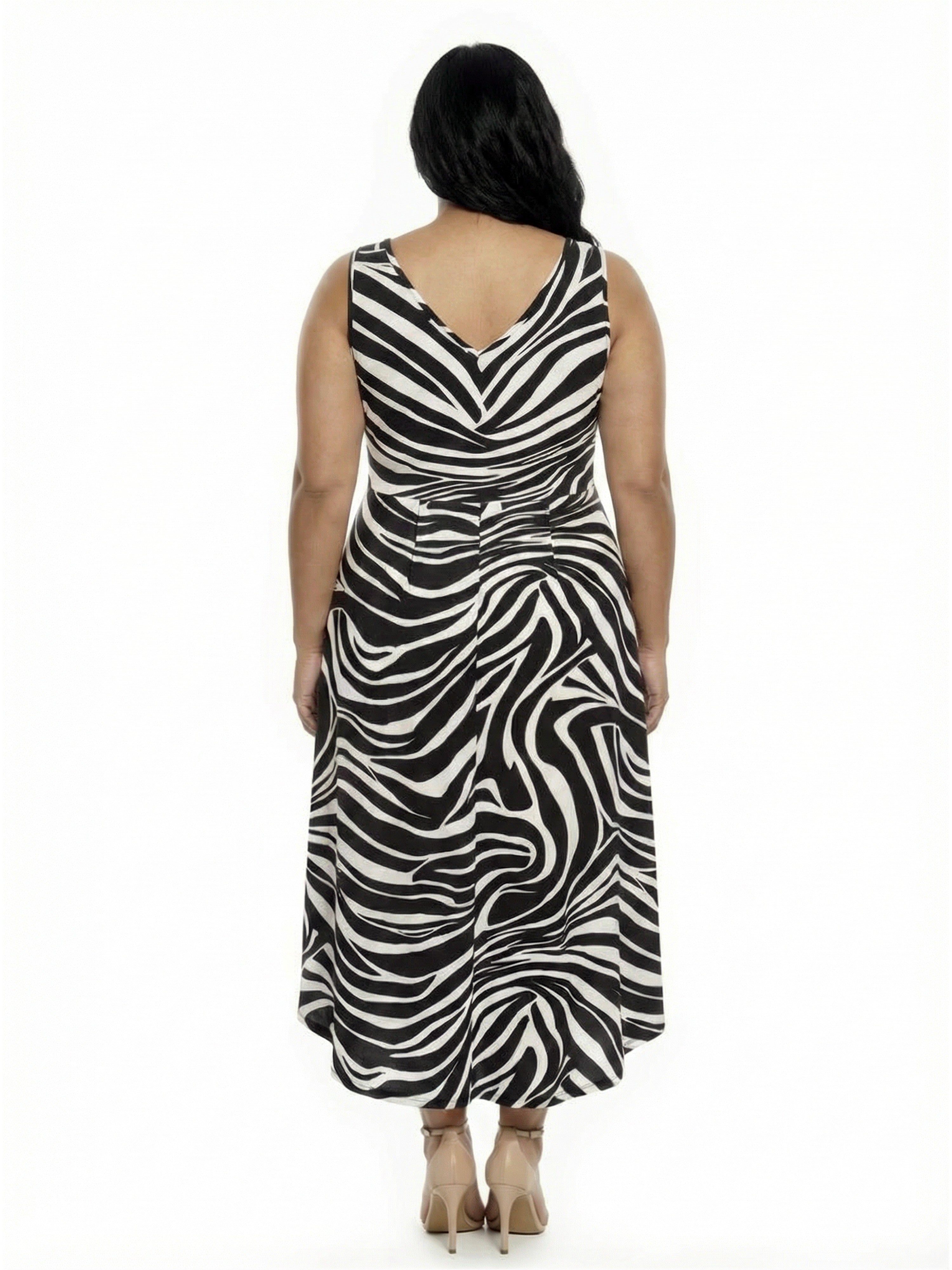 Elevate Curvy Zebra Sleeveless Fit N Flare High Low Pocket Midi Dress