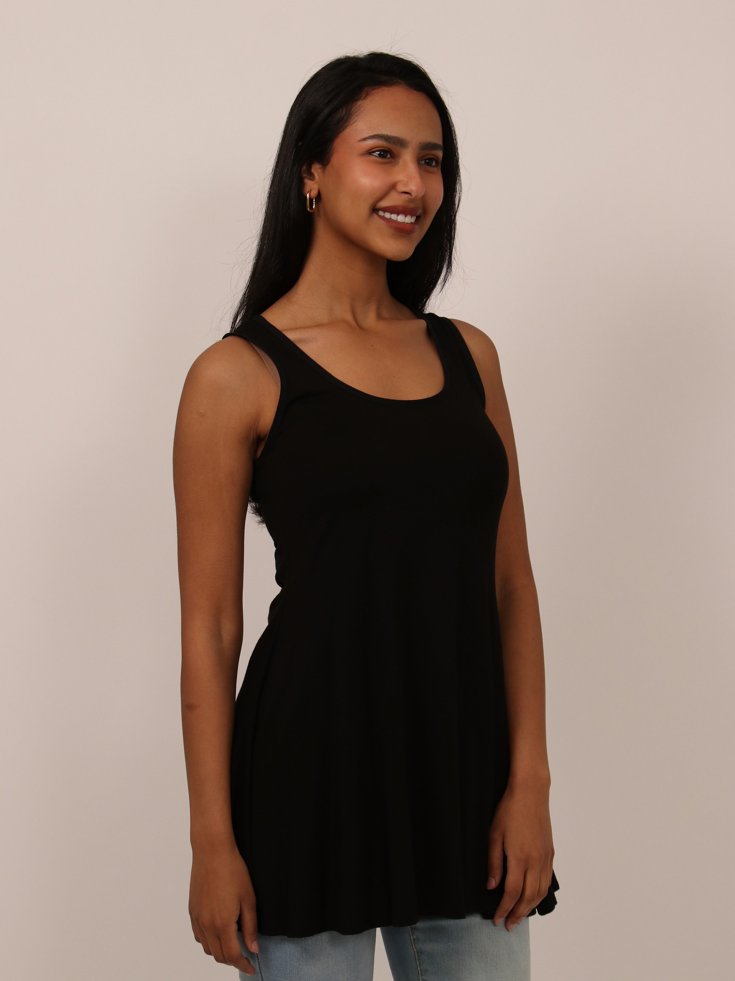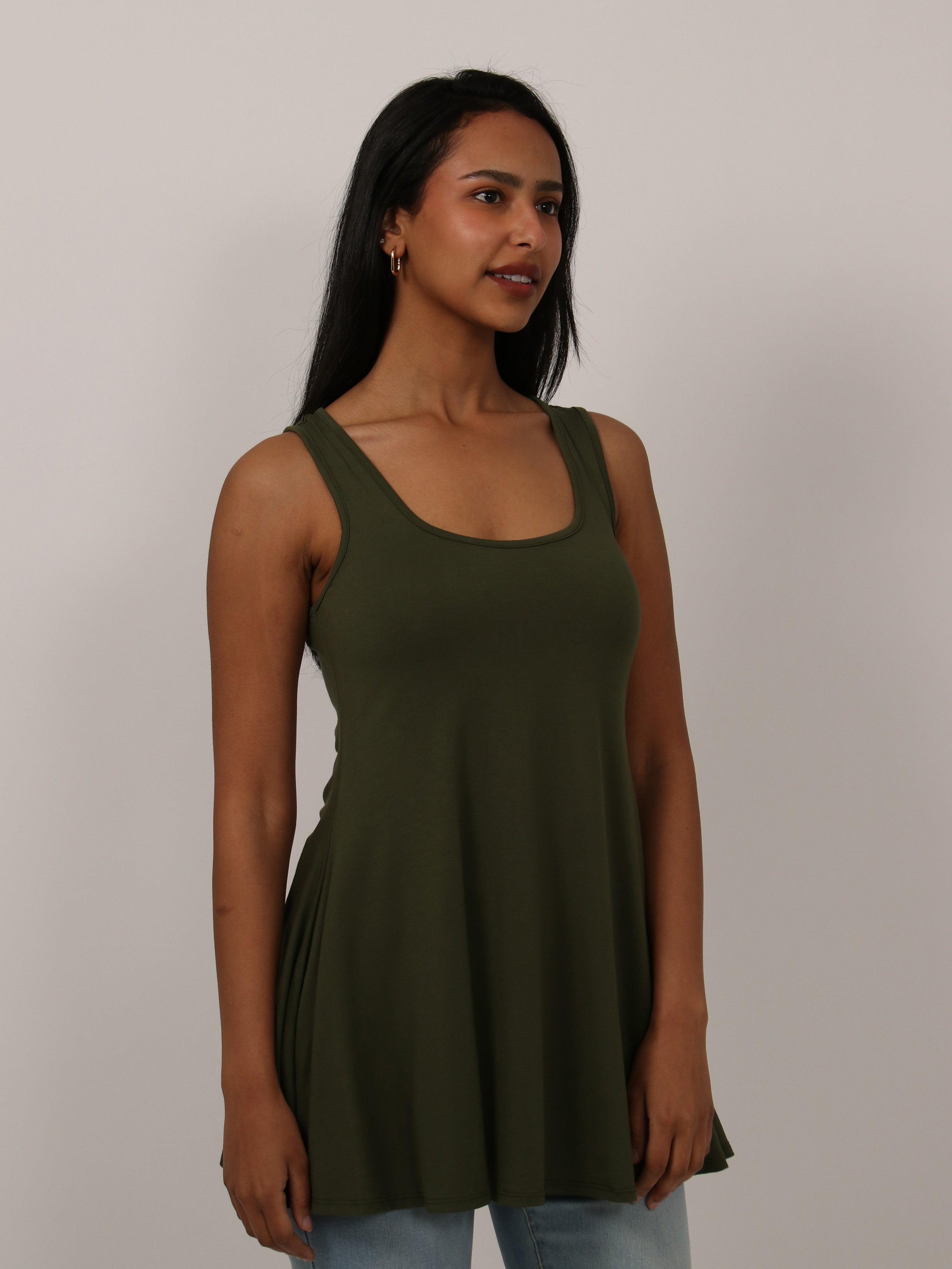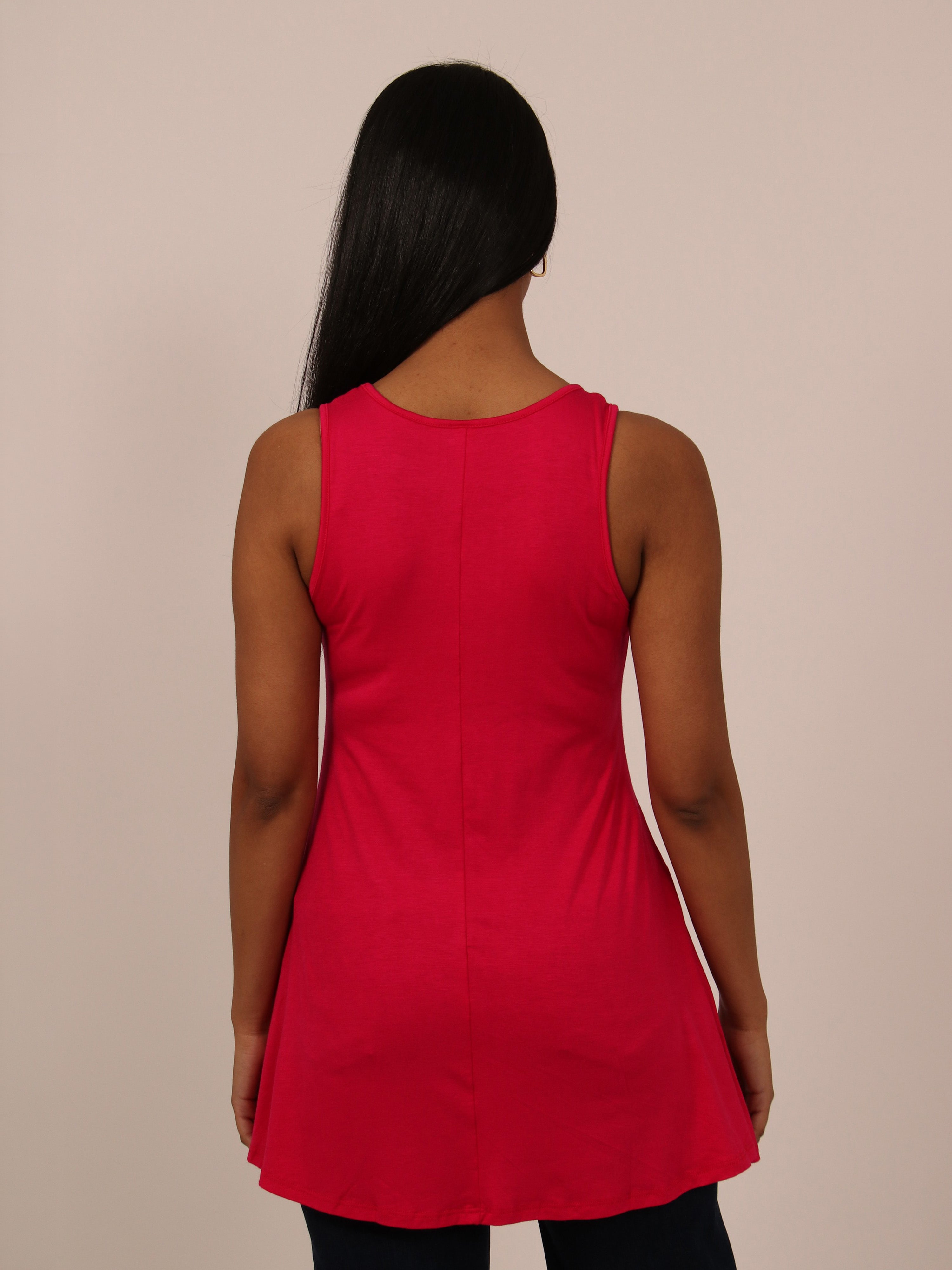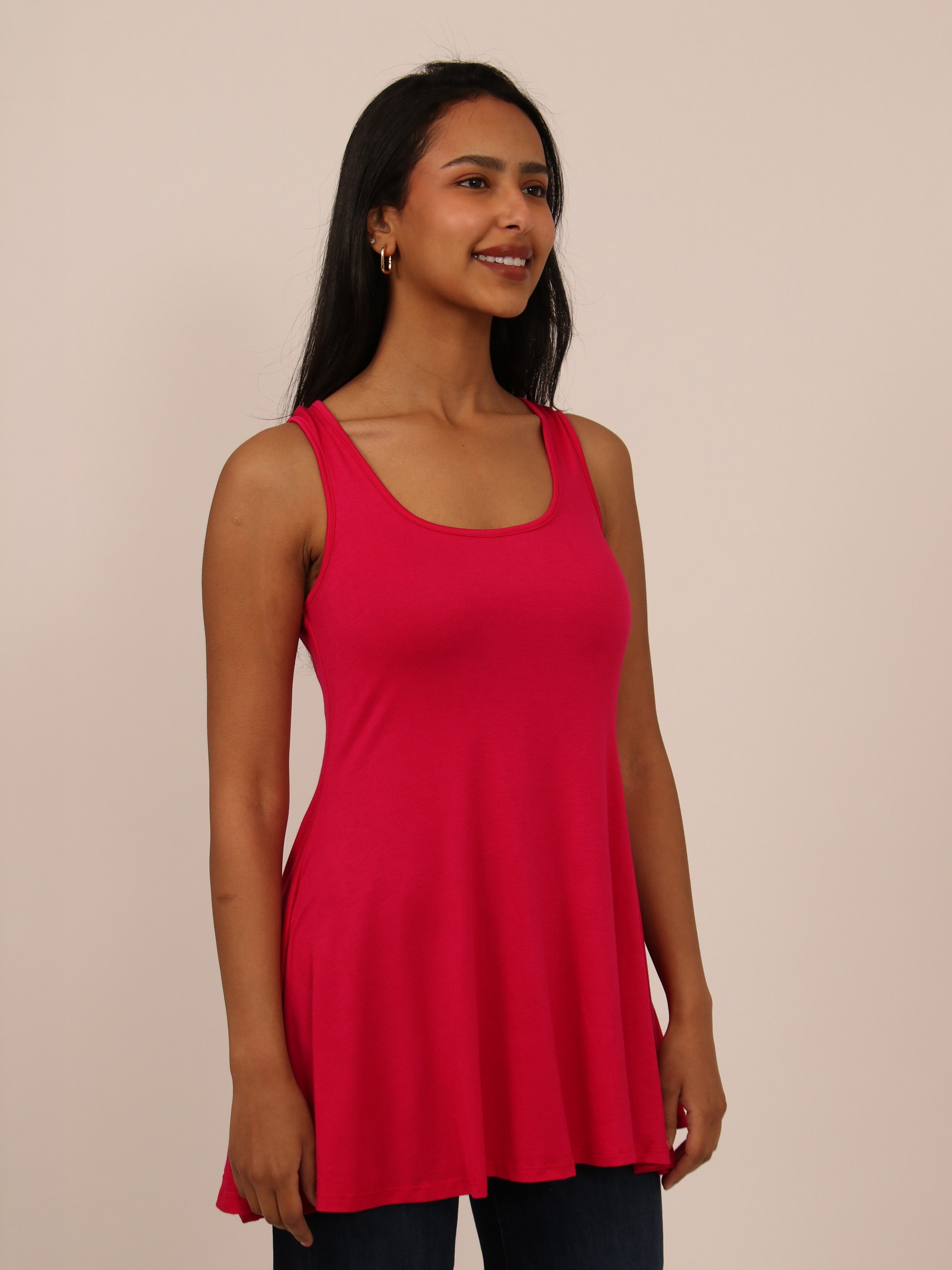 The flared shape of this tunic top accentuates the figure and is flattering for all. This piece comes in a variety of colors and can be dressed up and down for all occasions. The flowing hem, scooped neckline and soft silhouette makes this piece a trendy and comfortable must have.This long tank top is perfect for pairing with leggings, shorts, or jeans for an easy casual look. Made from a comfortable stretch material. Rayon Spandex Knit.