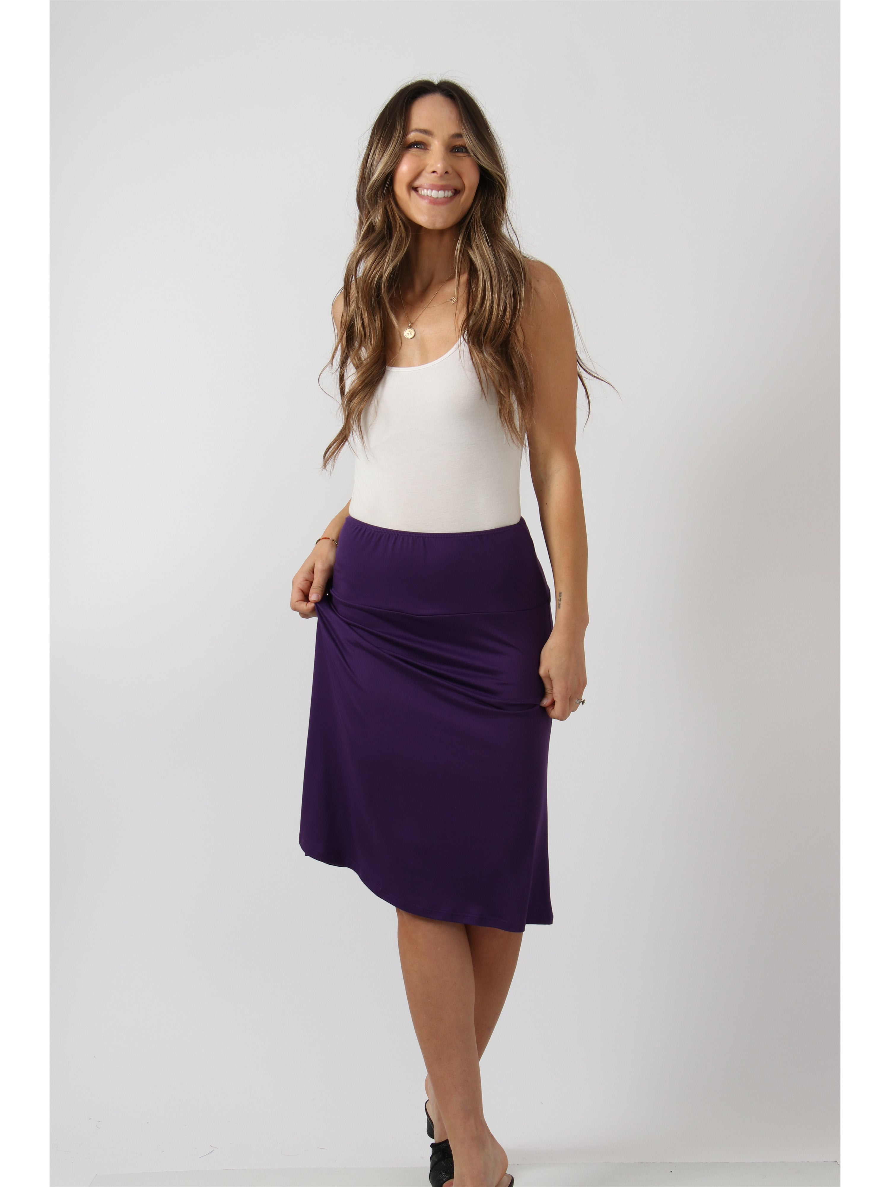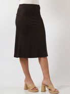 Add easy polish to your everyday outfits with this knee length a line skirt from 24seven Comfort Apparel. Made in a soft rayon spandex blend, it offers a smooth stretch fit, a comfy elastic waist, and a relaxed shape that moves with you. This machine washable style pairs well with tees for casual errands or with a blouse and flats for a simple pulled together look.