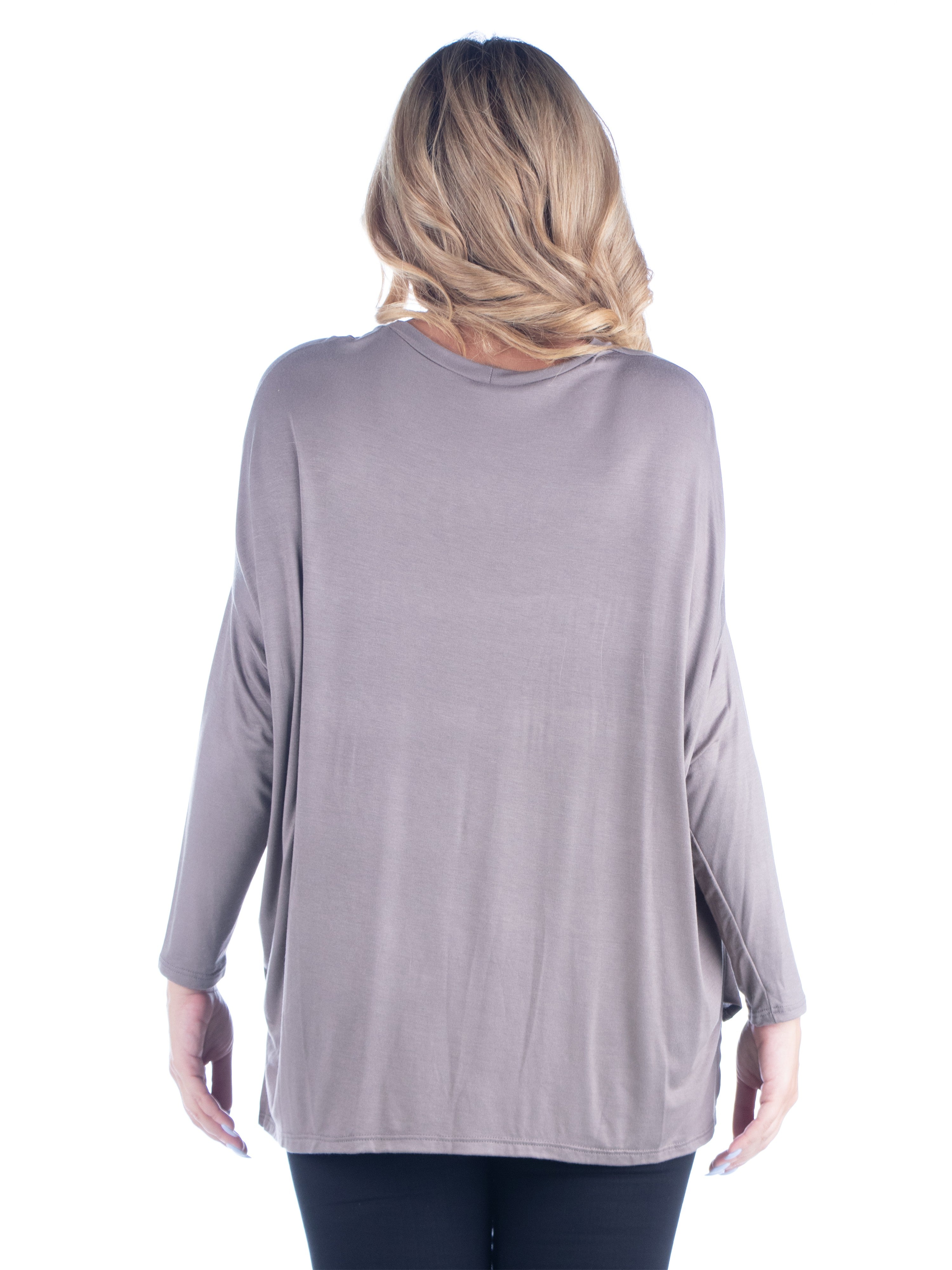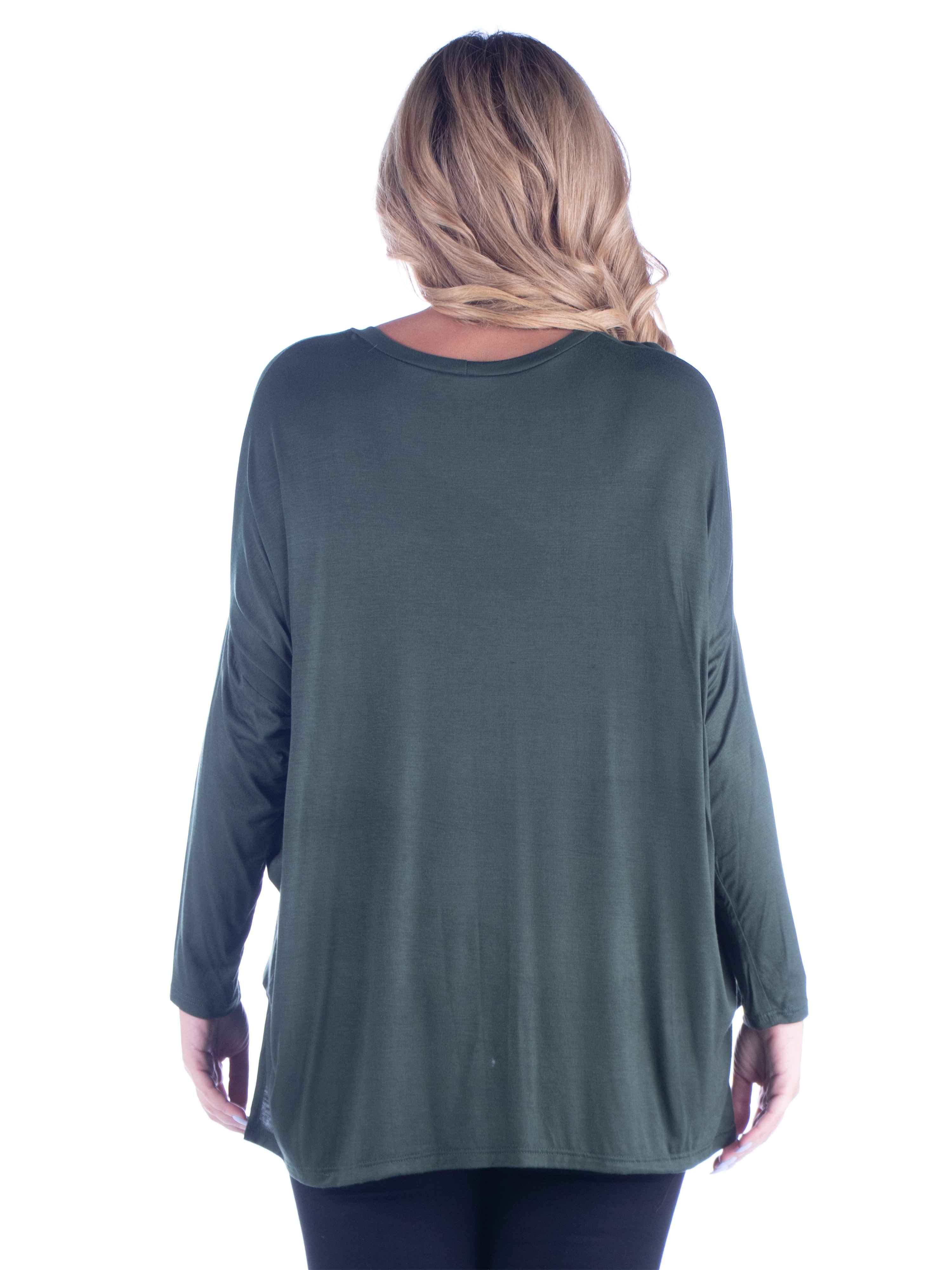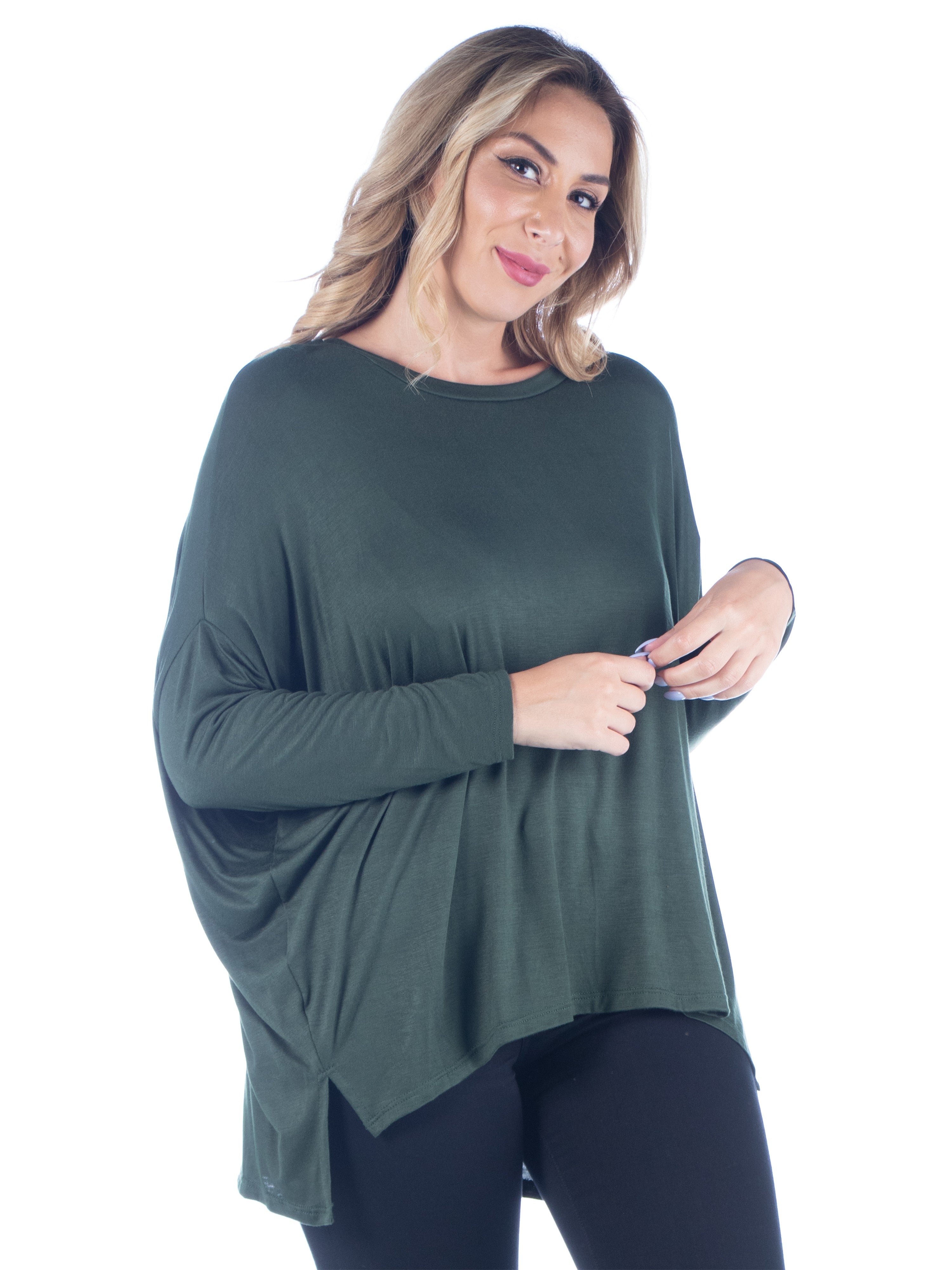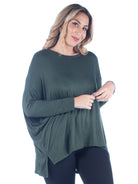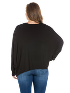 Relax in effortless style with this dolman plus size top from 24seven Comfort Apparel, featuring an oversized silhouette, long sleeves, and a wide rounded neckline. Made from lightweight stretch material and available in three solid colors, it drapes beautifully for a comfortable, laid back fit that is easy to wear. It is machine washable and tumble dry for simple care.