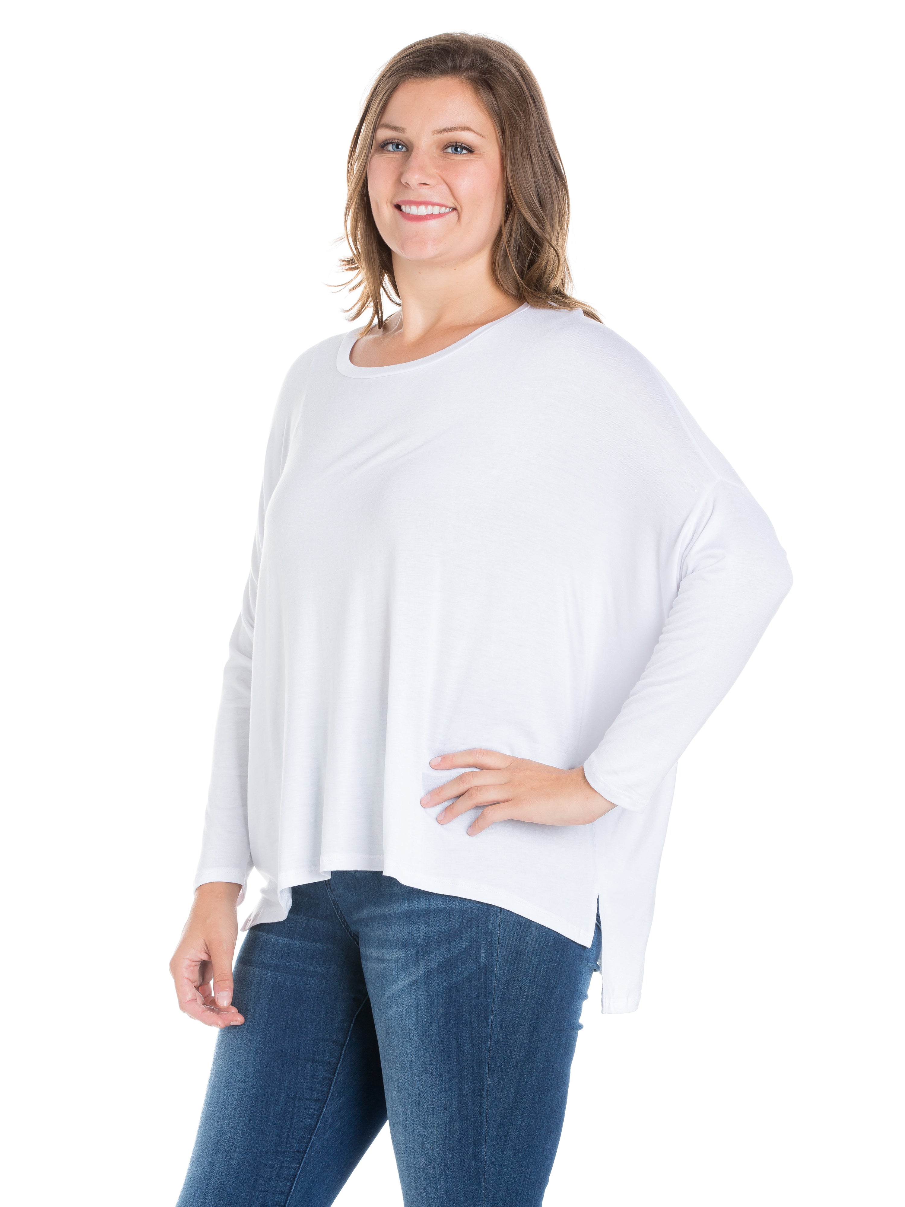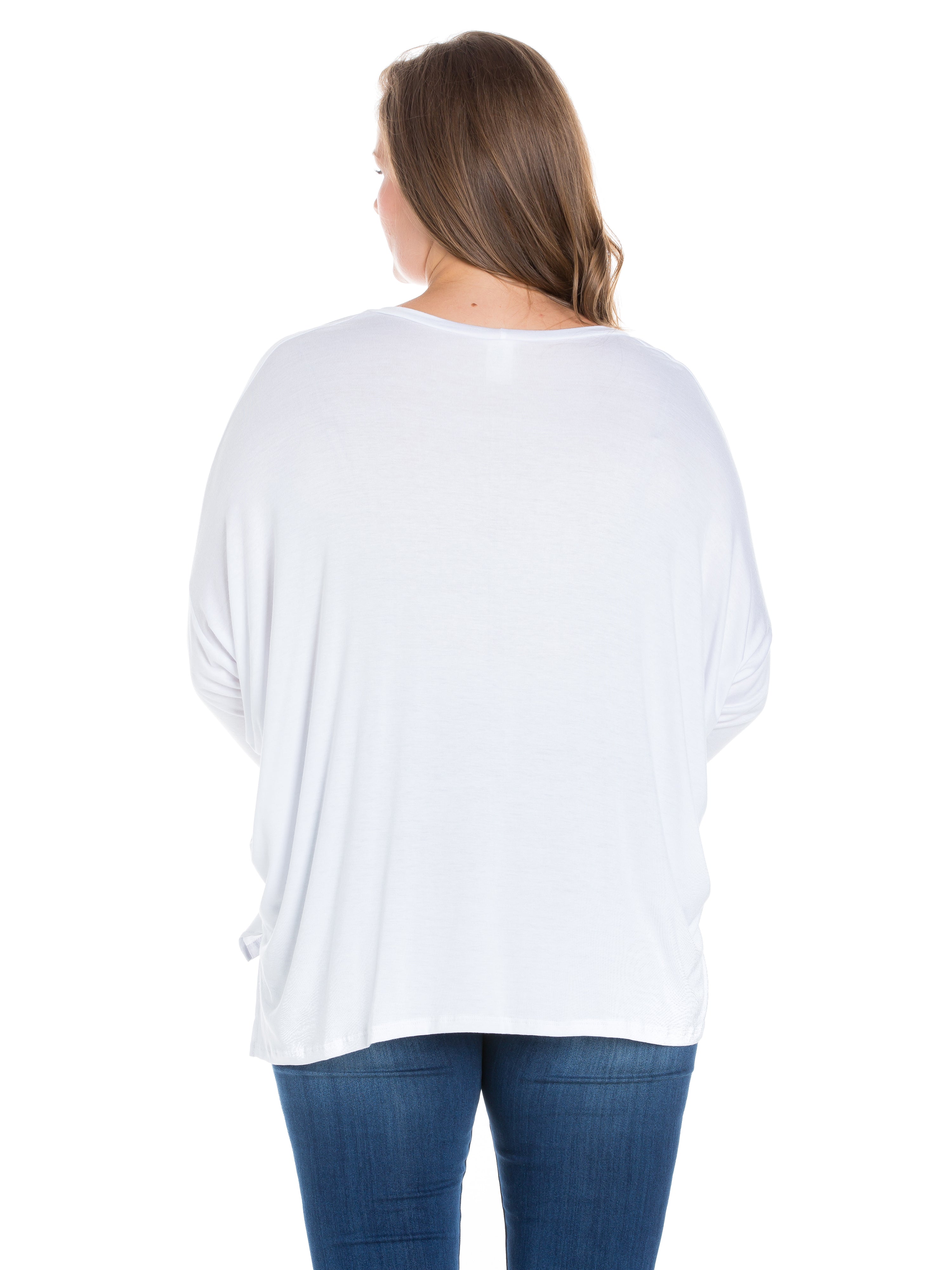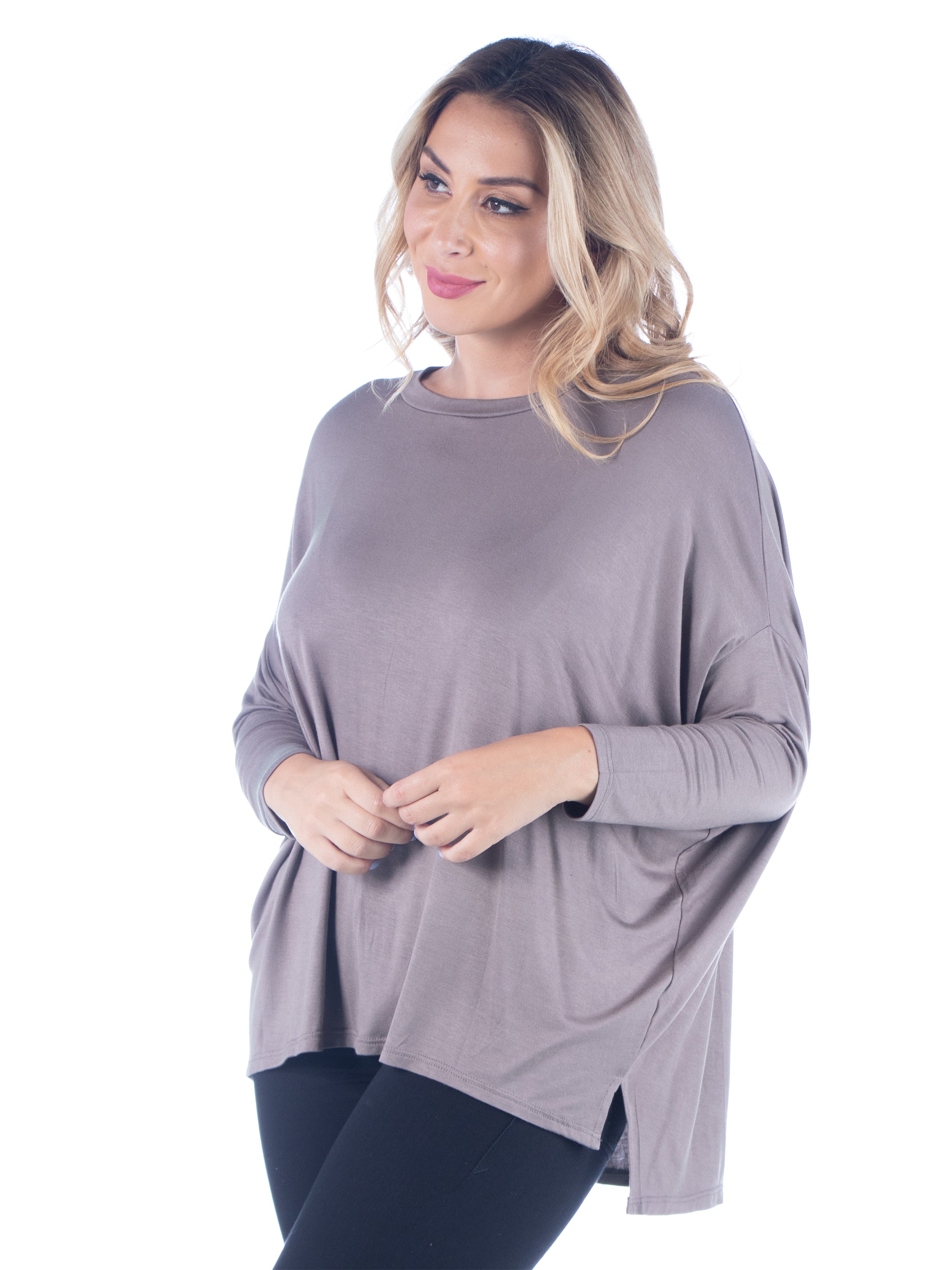 Relax in effortless style with this dolman plus size top from 24seven Comfort Apparel, featuring an oversized silhouette, long sleeves, and a wide rounded neckline. Made from lightweight stretch material and available in three solid colors, it drapes beautifully for a comfortable, laid back fit that is easy to wear. It is machine washable and tumble dry for simple care.