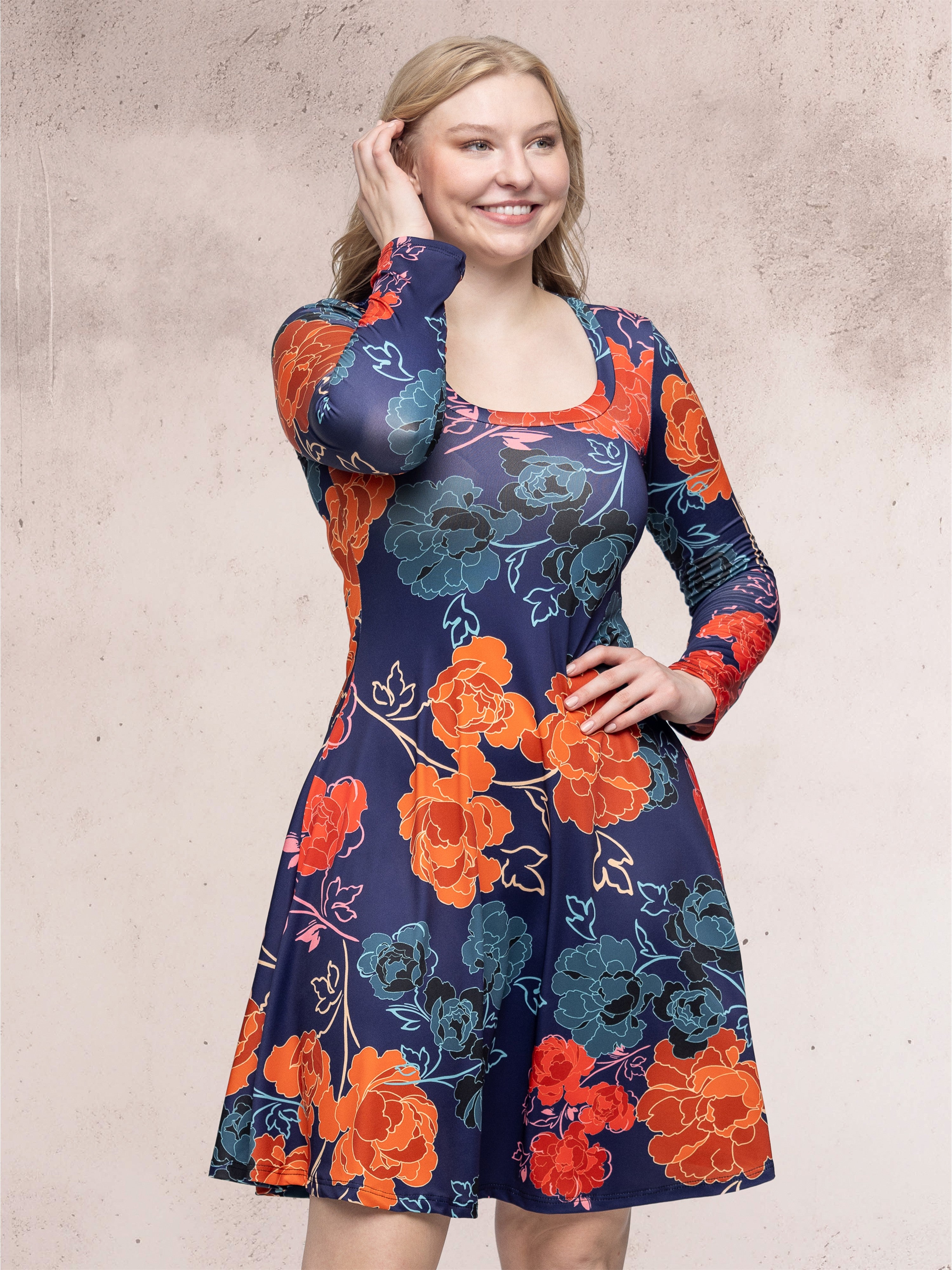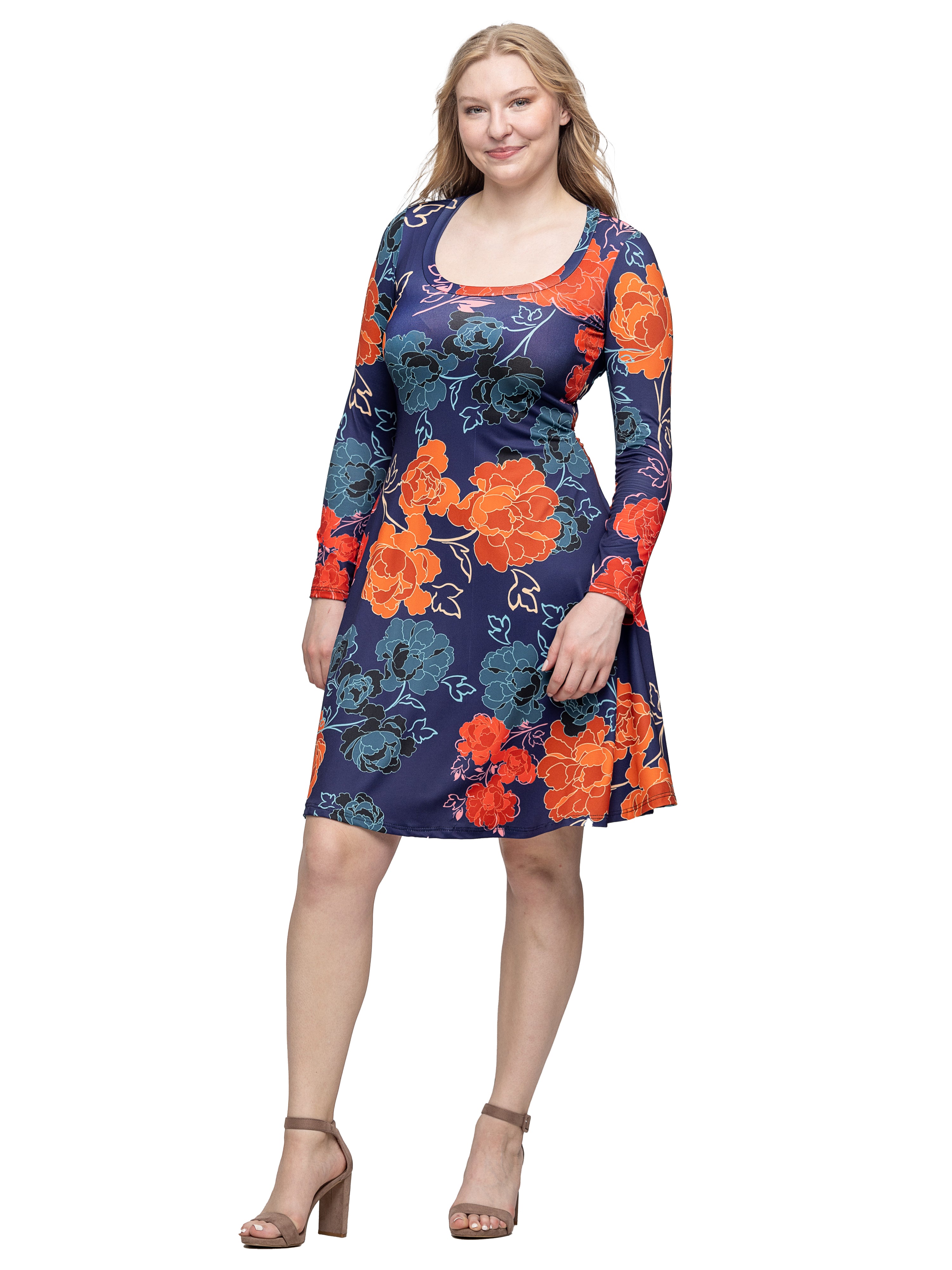 Step into timeless style with this navy floral A line dress from 24seven Comfort Apparel. The soft stretch fabric, classic scoop neckline, and long sleeves provide all day comfort and a flattering fit, while the charming blue and red floral print adds sophistication. This machine washable knee length dress pairs perfectly with flats for casual wear or heels for dressy occasions, offering versatile effortless elegance.