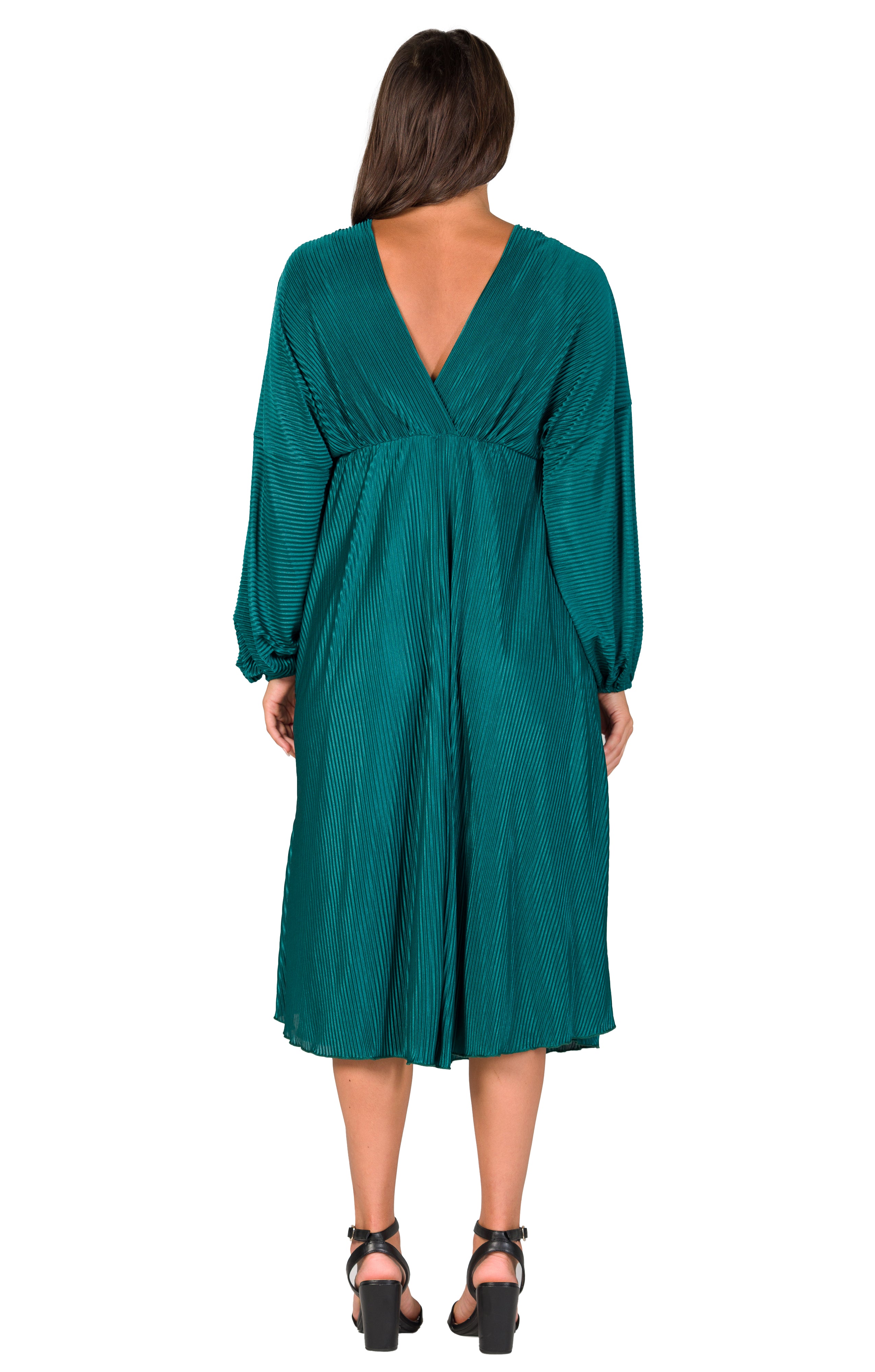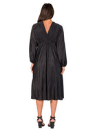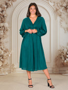 Step into radiant sophistication with this V-neck midi dress, designed to captivate from every angle. The flowing A-line silhouette drapes gracefully over the body, while pleated empire waist and voluminous bishop sleeves create an elegant shape. Crafted from soft, shimmery accordion fabric, it features a fully lined inner layer for confident, effortless wear. Machine washable, this dress combines glamour and comfort for unforgettable evenings.