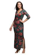 Add a bold and stylish touch to your wardrobe with this green floral print faux wrap maxi dress from 24seven Comfort Apparel. Designed with a flattering V neckline and three quarter sleeves, it features a draped waist that accentuates your shape and a sleek side slit for effortless movement. The fitted silhouette creates a graceful, feminine finish, while the soft stretch fabric ensures all day comfort. Machine washable for easy, everyday care.