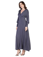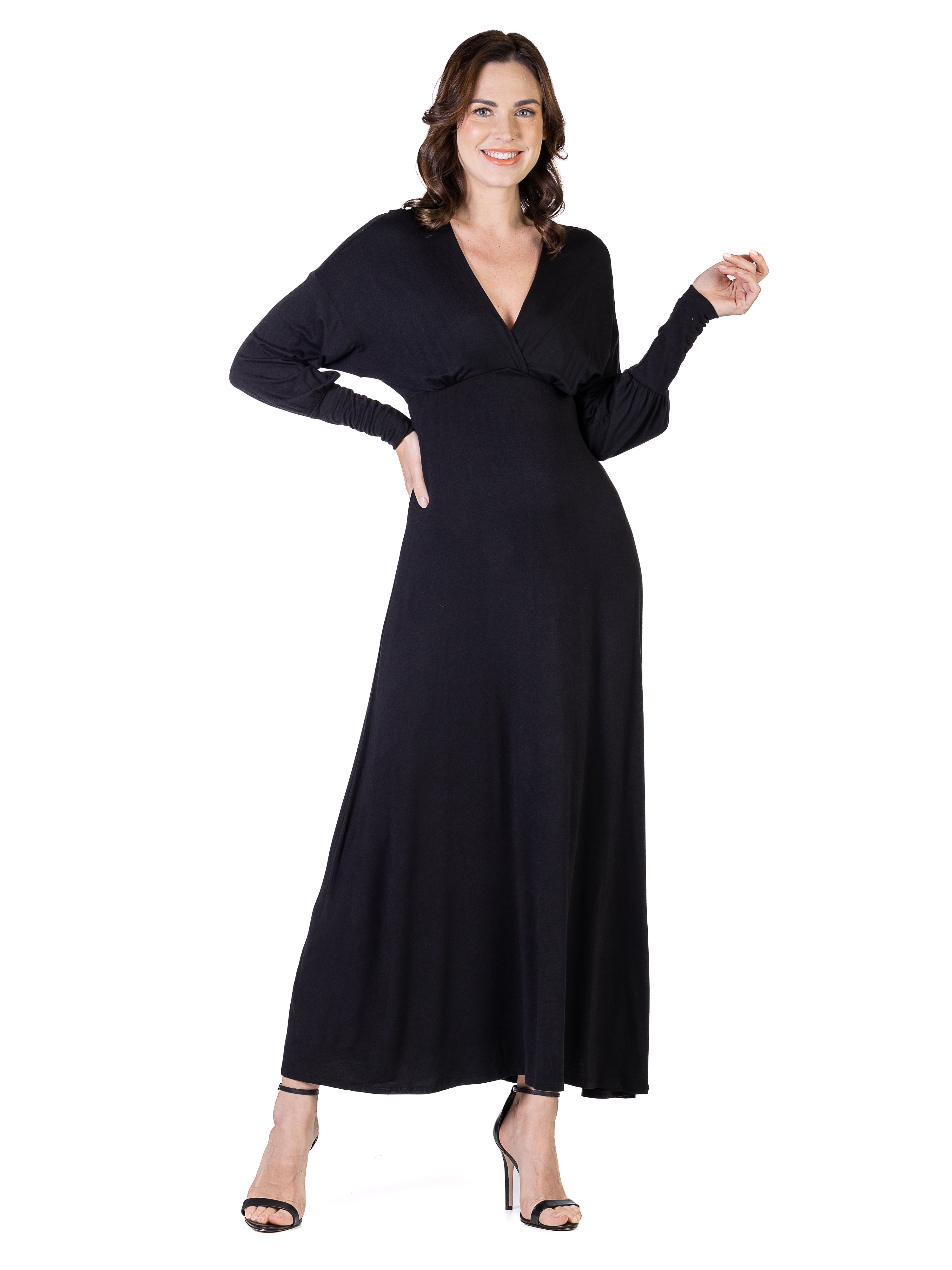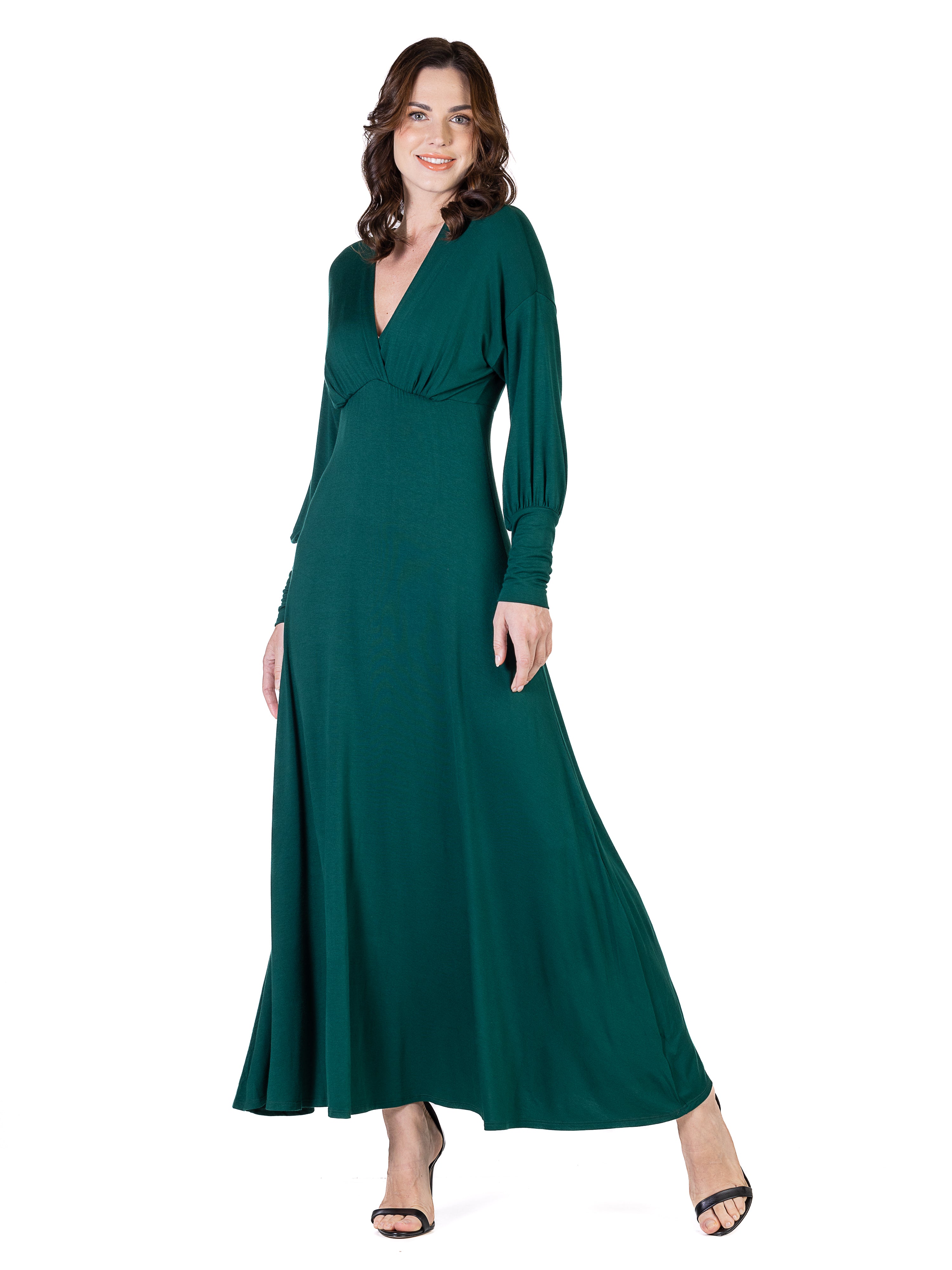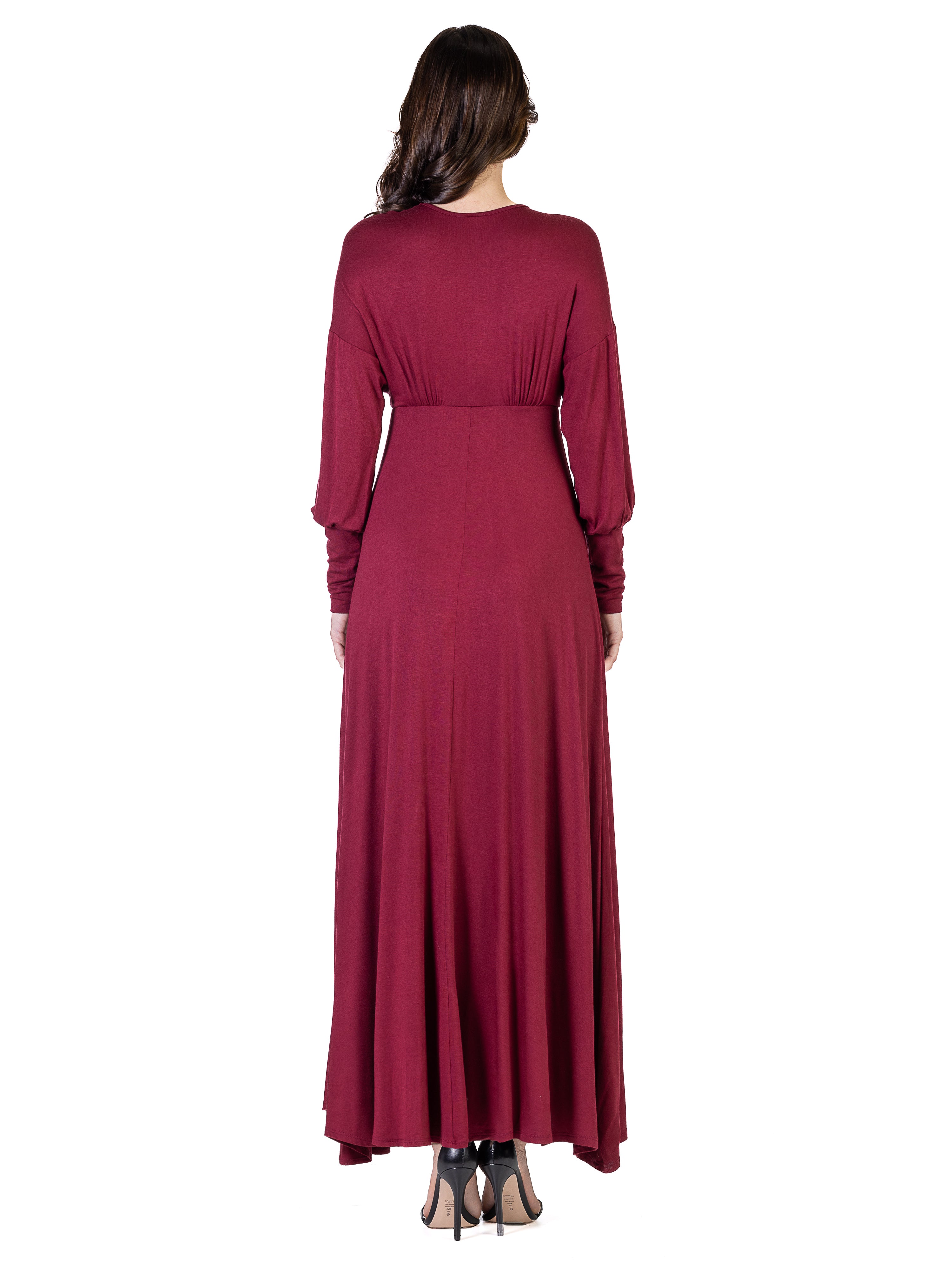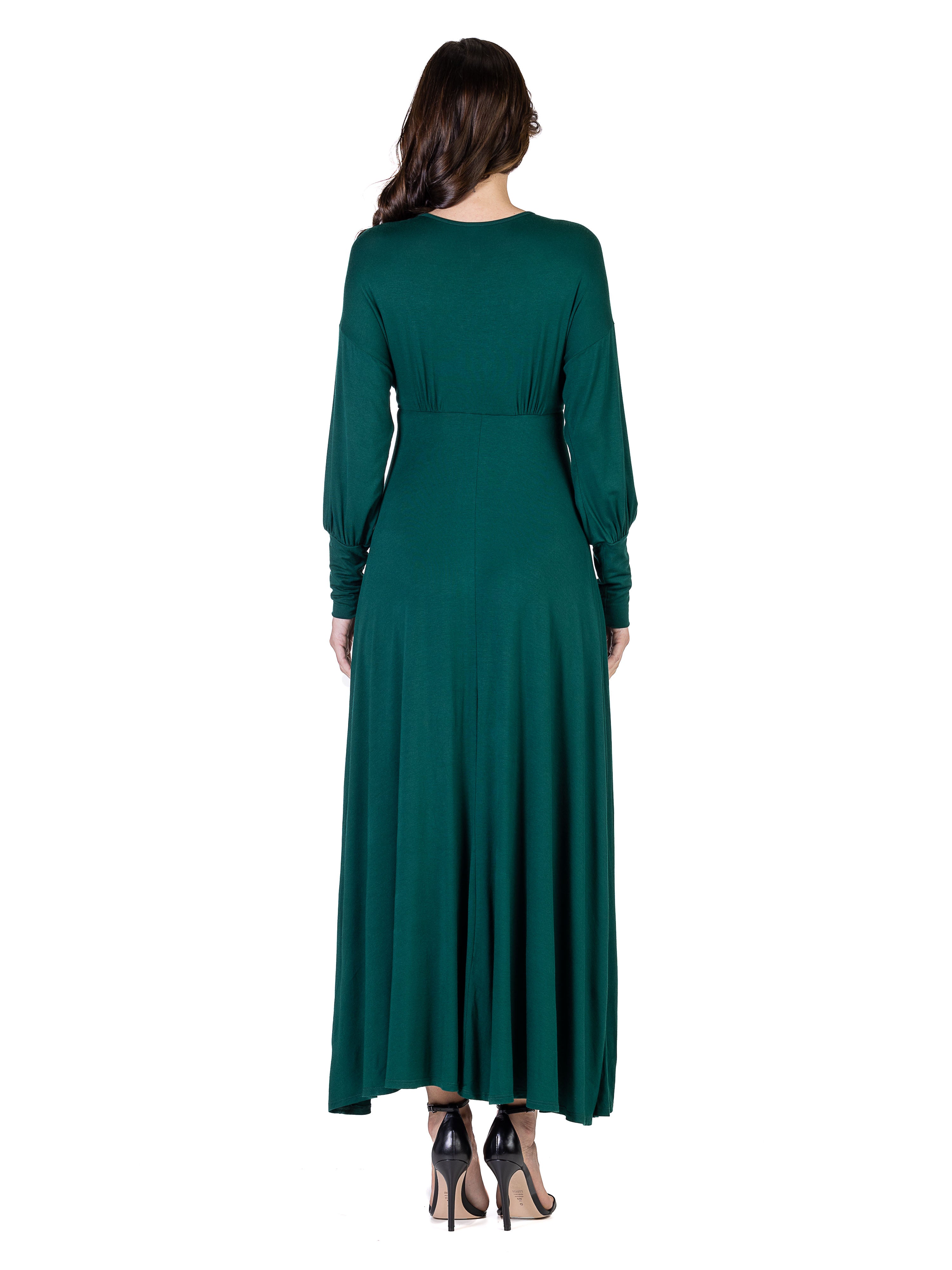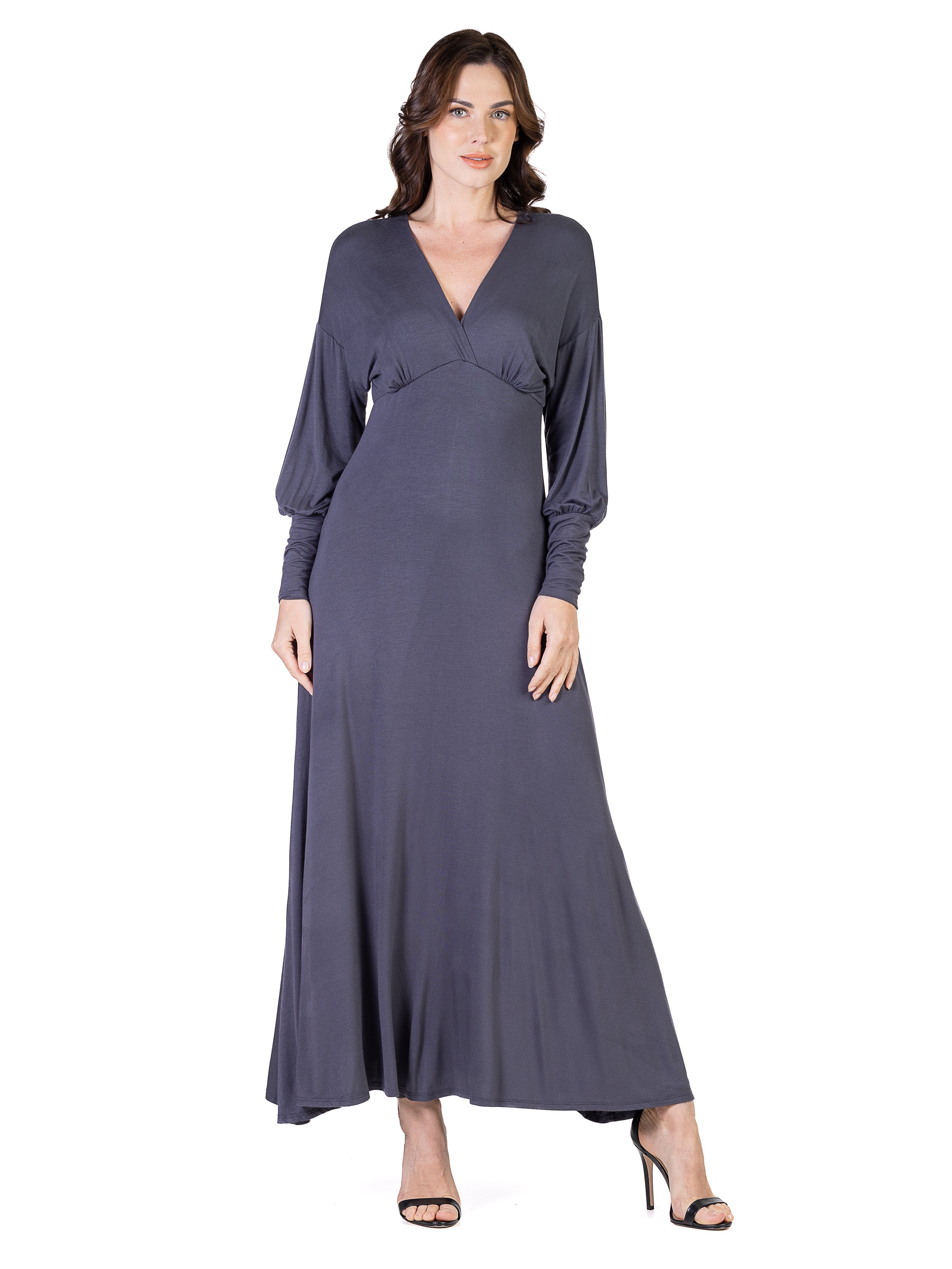 Exude effortless elegance in this 24seven Comfort Apparel maxi dress, where a flowing A line silhouette meets smooth, comfortable fabric. The trendy bishop sleeves, flattering empire waist, and tasteful V neckline create a chic, figure-enhancing look. Perfect for special occasions or evenings out, this dress is machine washable for easy, stylish wear.