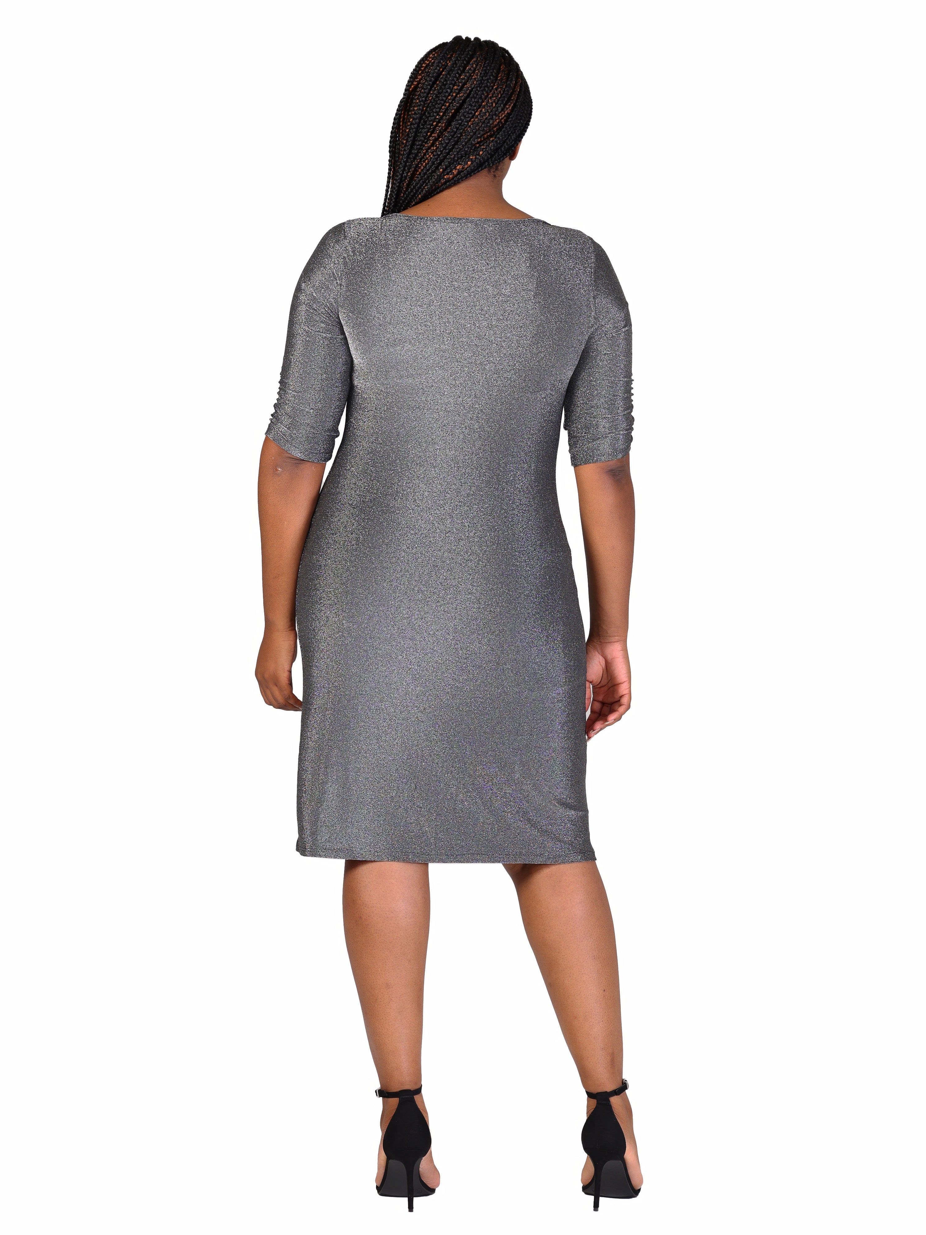 Turn heads with this plus size elbow length sleeve shimmer bodycon mini party dress from 24seven Comfort Apparel. Crafted from soft metallic shimmery knit fabric, it offers a flattering bodycon fit with ruched sleeves and mini length for a flirty look. Machine washable and tumble dry for easy care, this dress is perfect for parties or nights out.