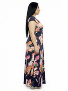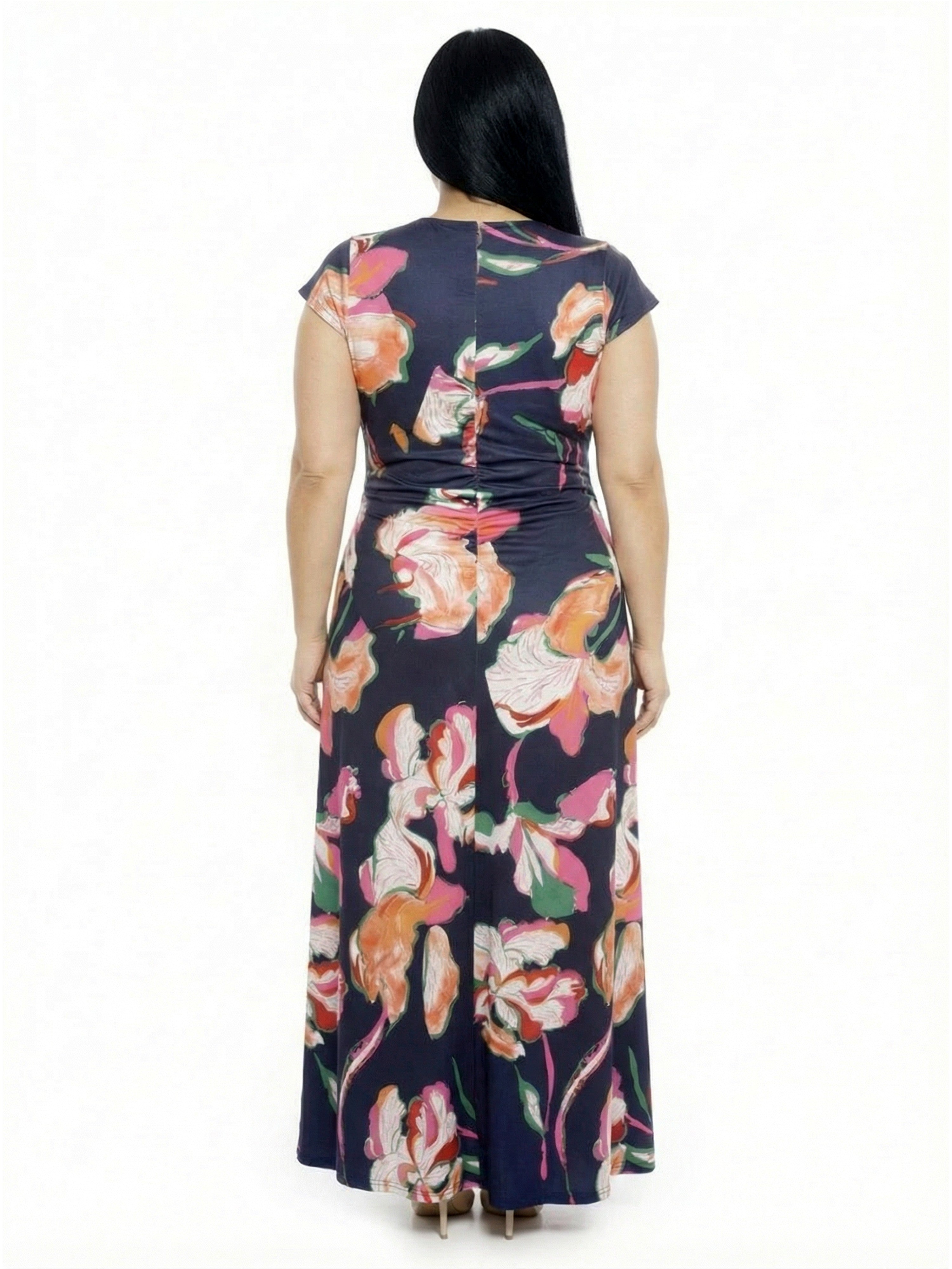 Elevate Curvy Floral V-Neck Cap Sleeve Ruched Front Maxi Length Dress