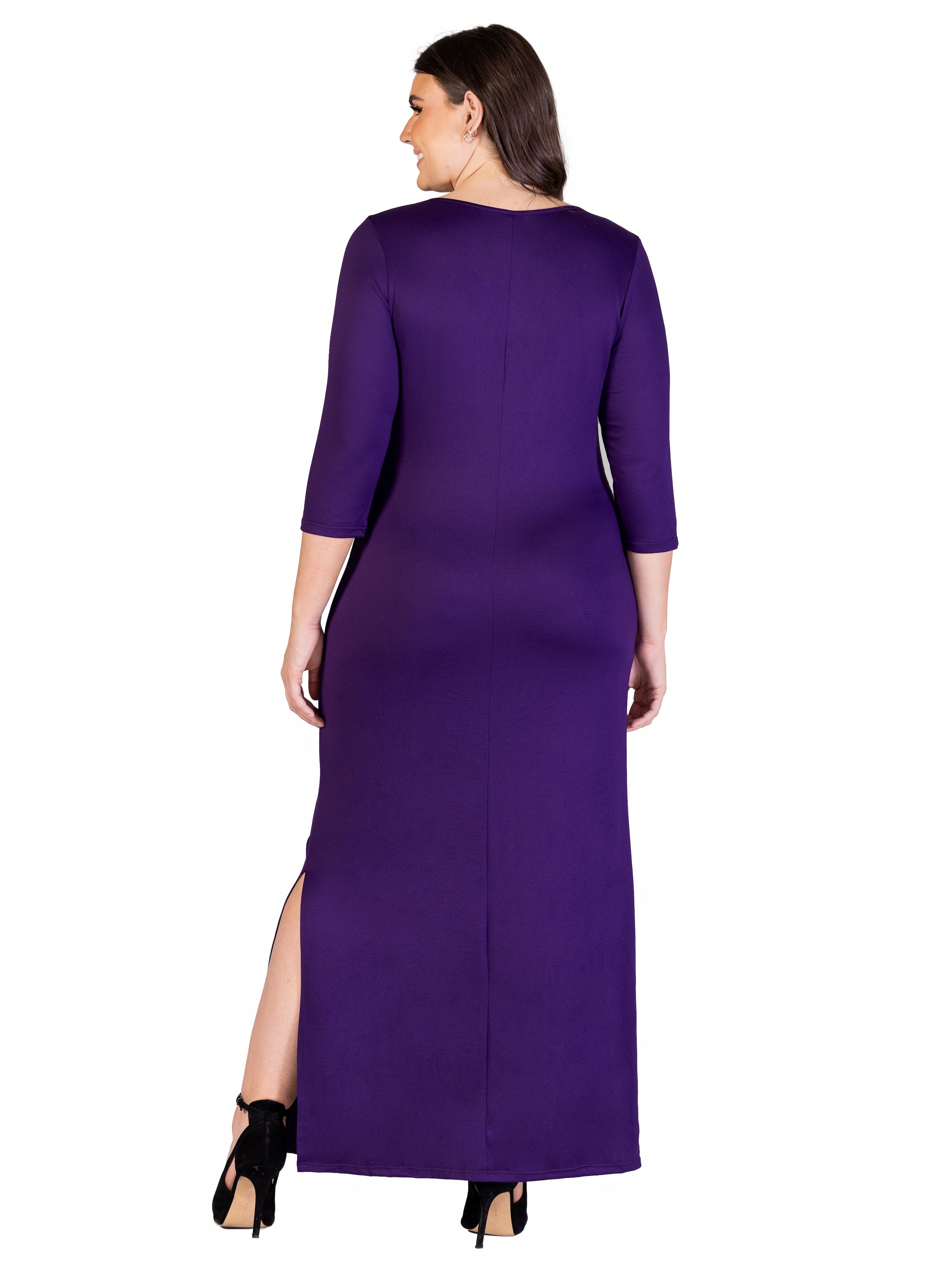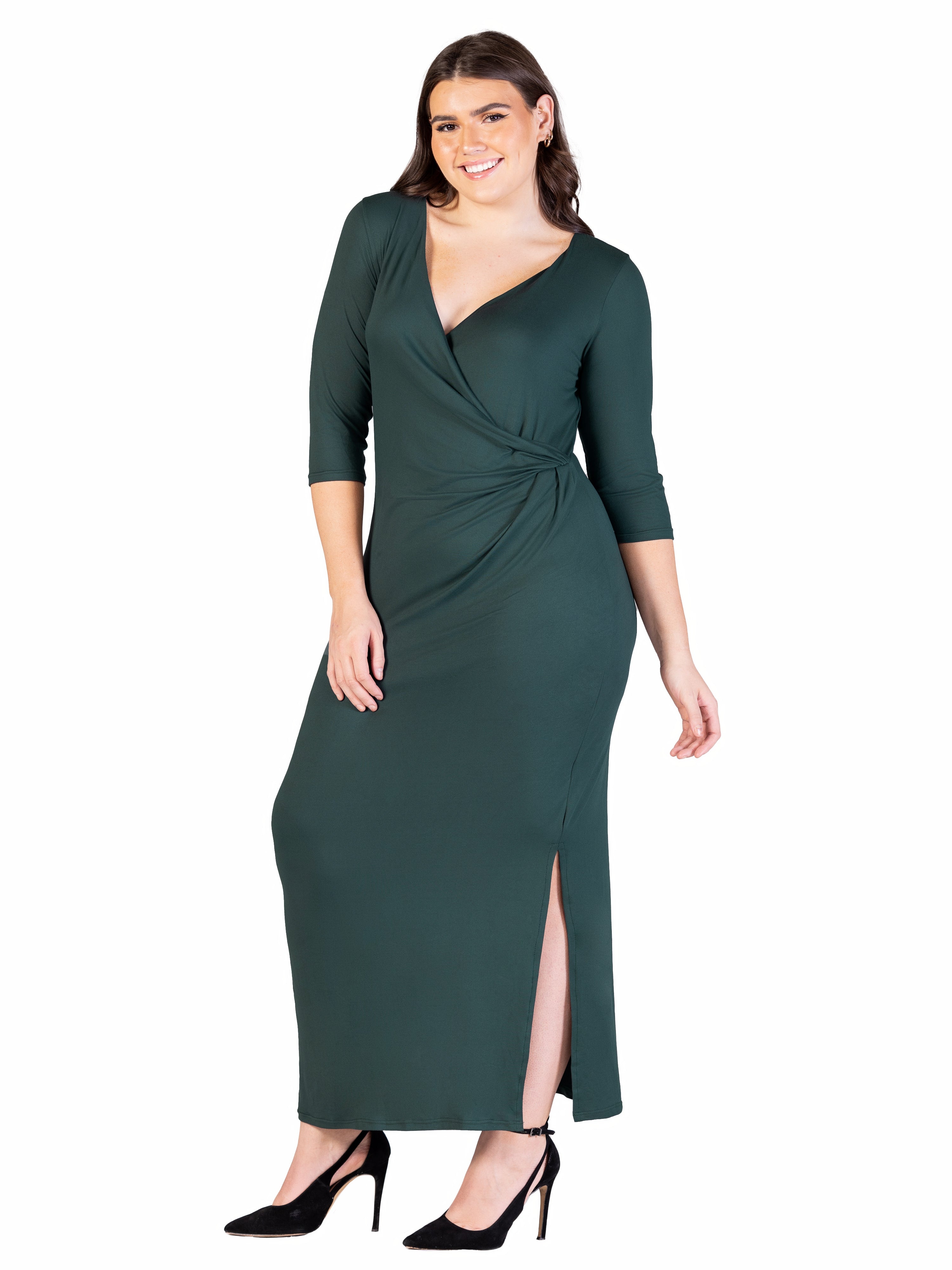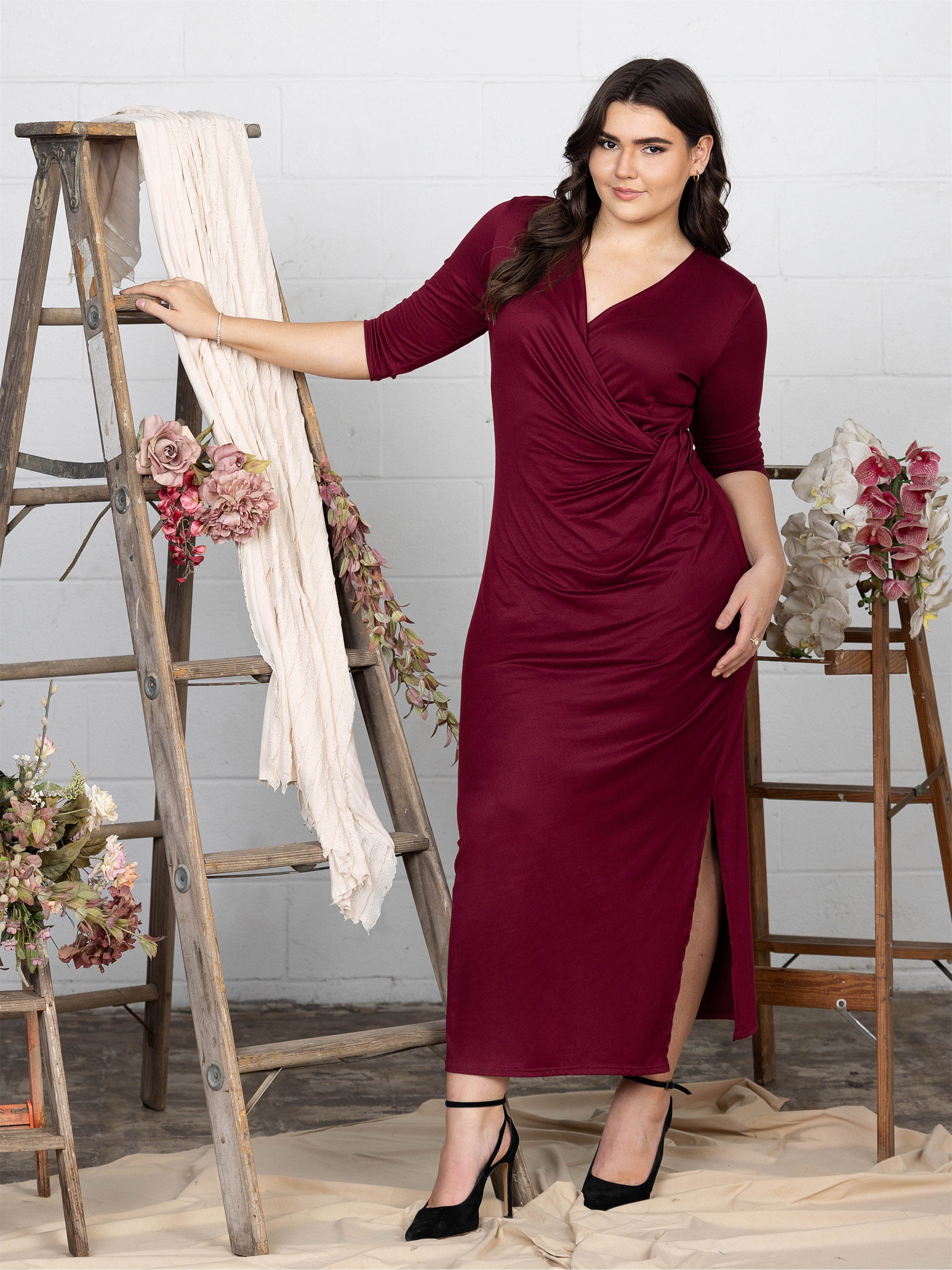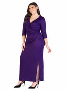 Turn heads in this faux wrap plus size maxi dress from 24seven Comfort Apparel, featuring a flattering V neck, three-quarter sleeves, gathered waist, and a sexy above the knee side slit. Its flowing silhouette drapes beautifully for every figure, offering effortless style in black or burgundy. It is machine washable and tumble dry for easy care.