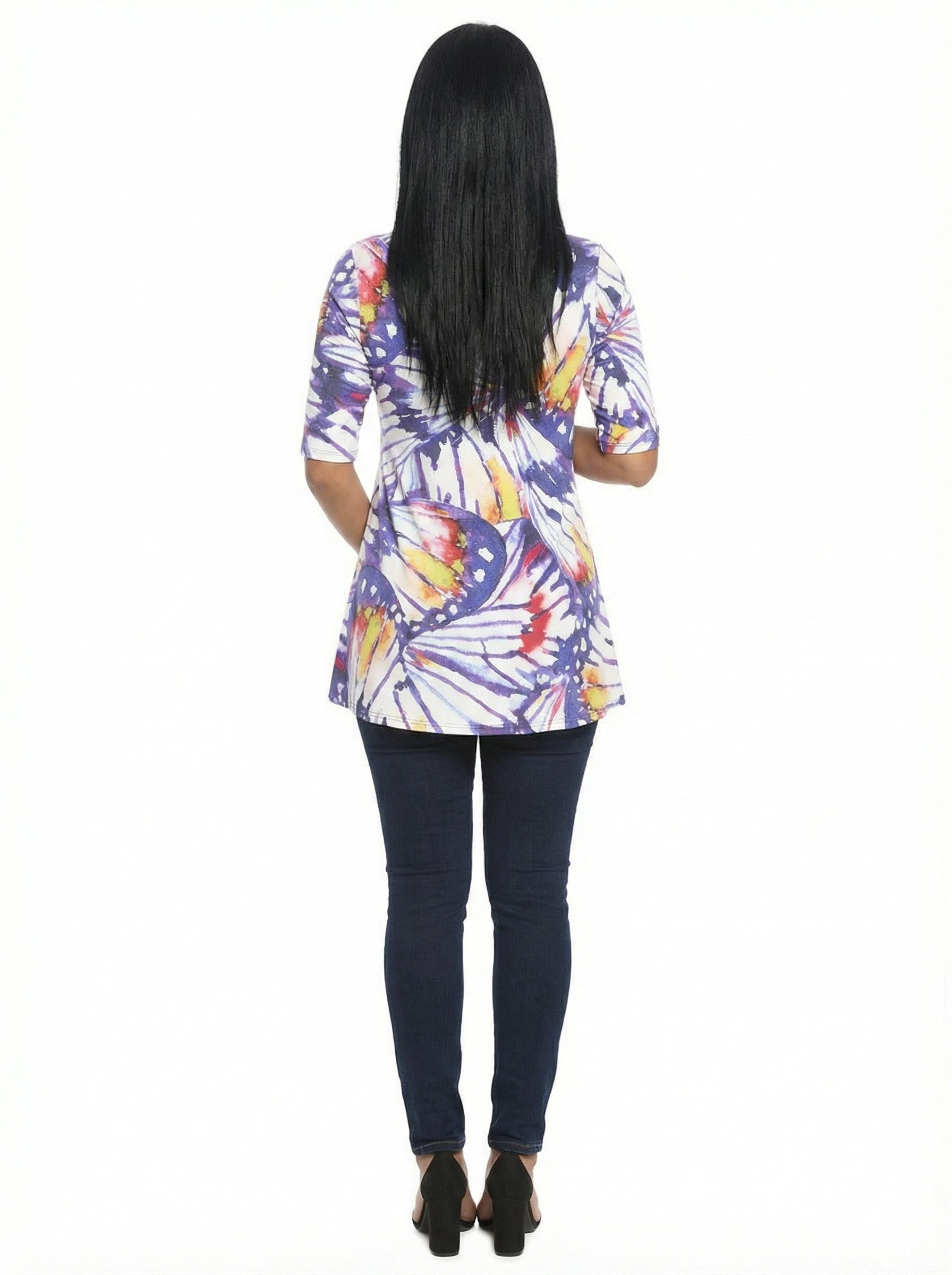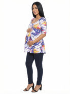Add modern flair to your wardrobe with this 24seven Comfort Apparel maternity purple oversized butterfly print swing tunic top, styled with a classic scoop neckline and easy elbow sleeves for all day comfort. The black abstract print brings bold dimension, while the soft stretch fabric is machine washable and tumble dry. Pair with leggings or slim pants for a polished, effortless look.