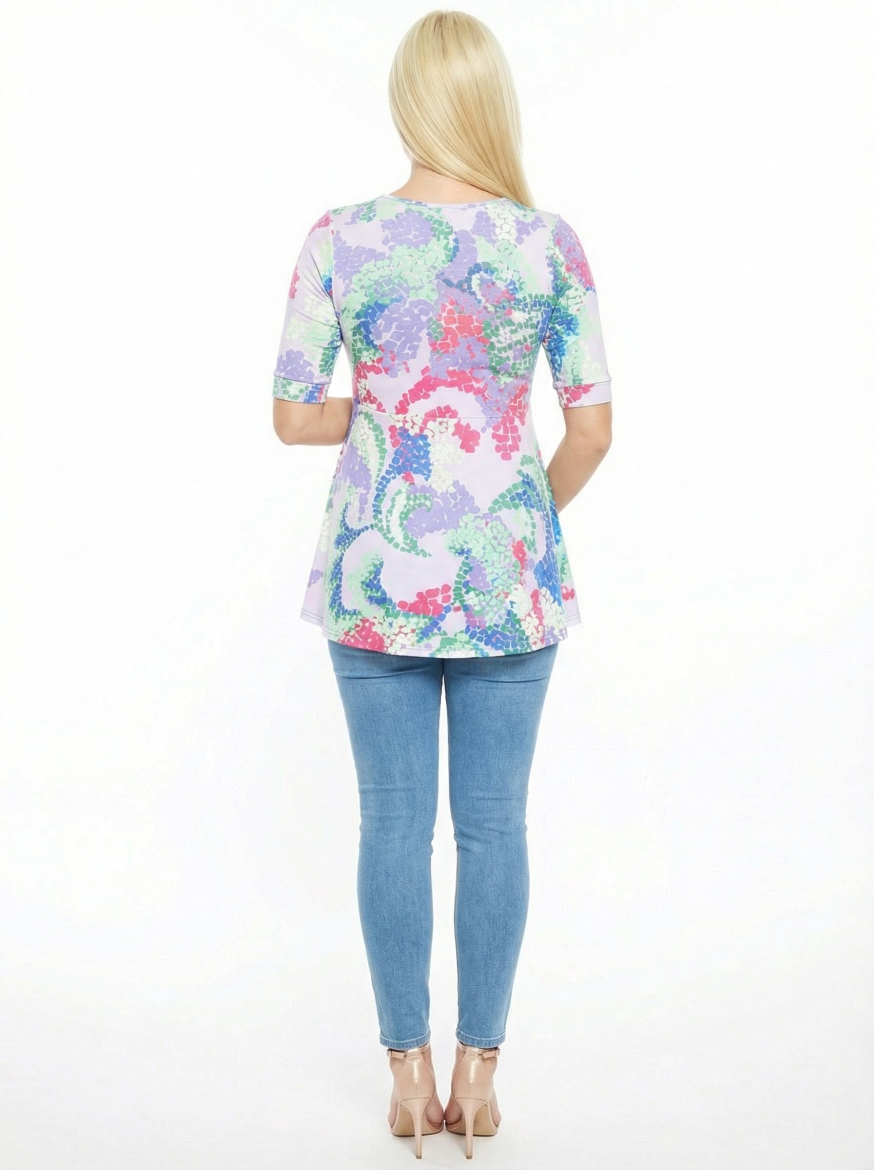 Refresh your look with this 24seven Comfort Apparel maternity lilac abstract print henley style swing tunic. The V neck and elbow sleeves create an easy, flattering shape, while the soft stretch fabric keeps you comfortable through the day. Machine washable and tumble dry, it pairs effortlessly with leggings or slim denim for a bright, modern finish.