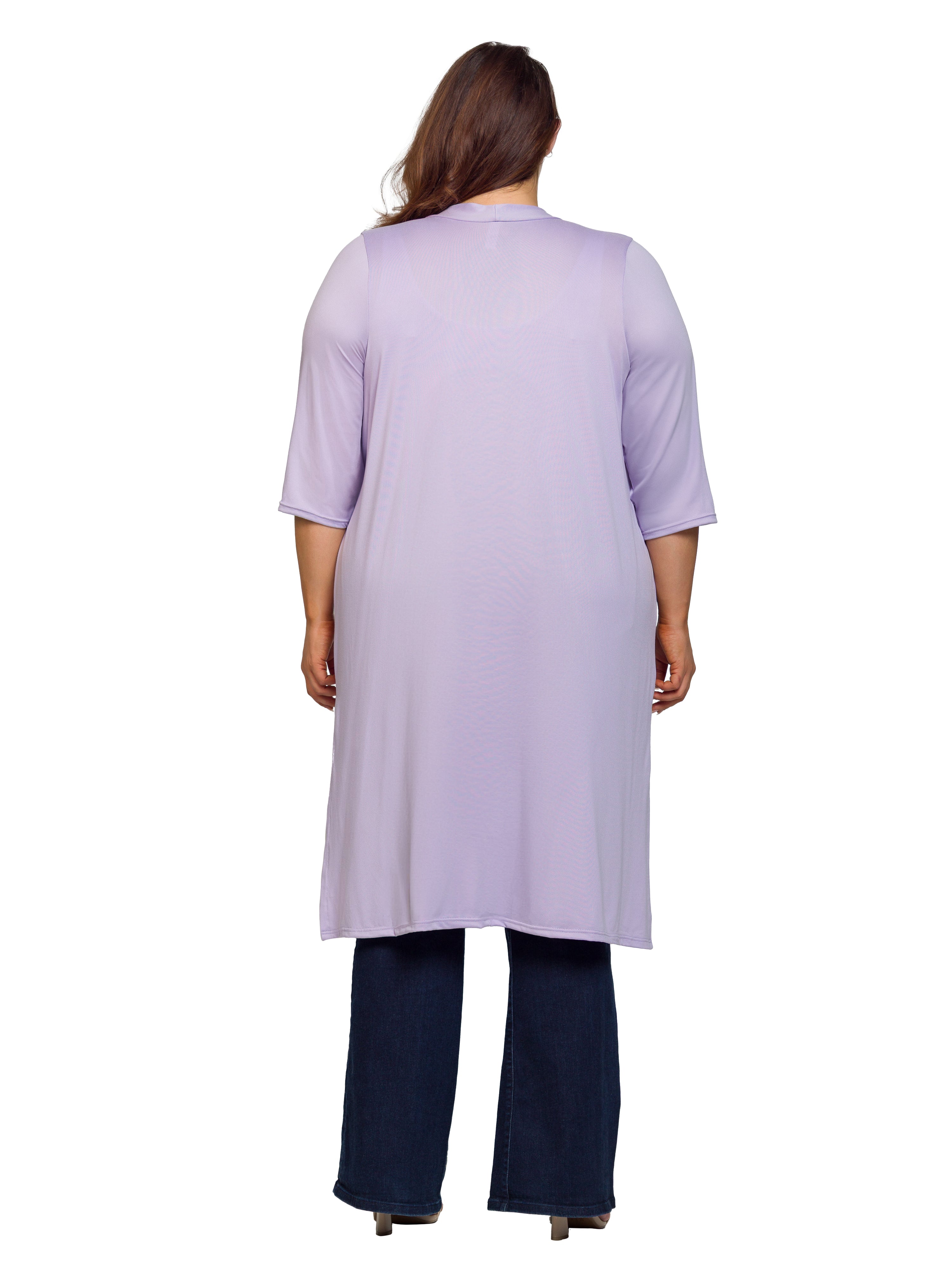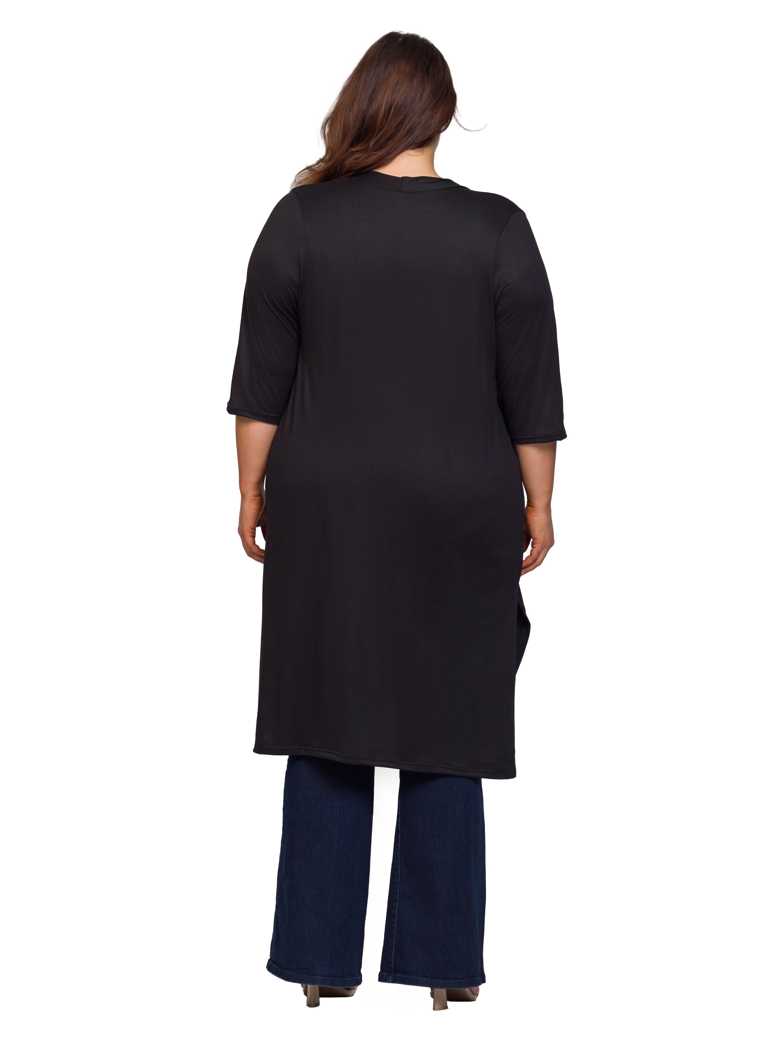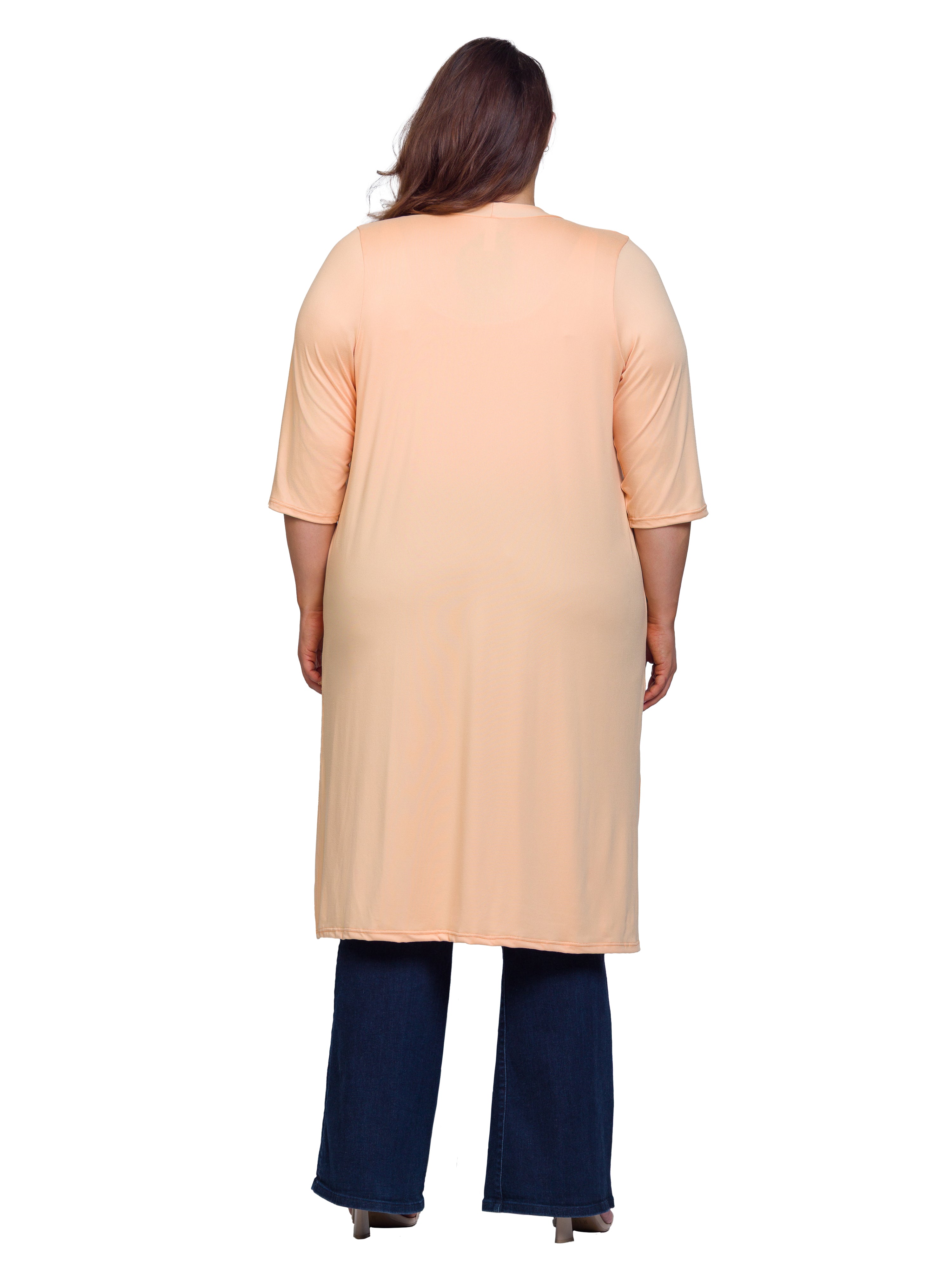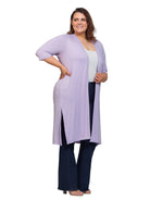 Layer in effortless style with this plus size duster cardigan from 24seven Comfort Apparel, designed to elevate everyday looks with ease. Featuring a flattering open front, elbow length sleeves, and subtle side slits, this knee length cardigan offers comfortable movement with a polished finish. Perfect for layering over dresses, tops, or tanks, it transitions seamlessly from office wear to weekend outings. Crafted for convenience and versatility, it is machine washable and tumble dry, making it an easy, go to layering essential.