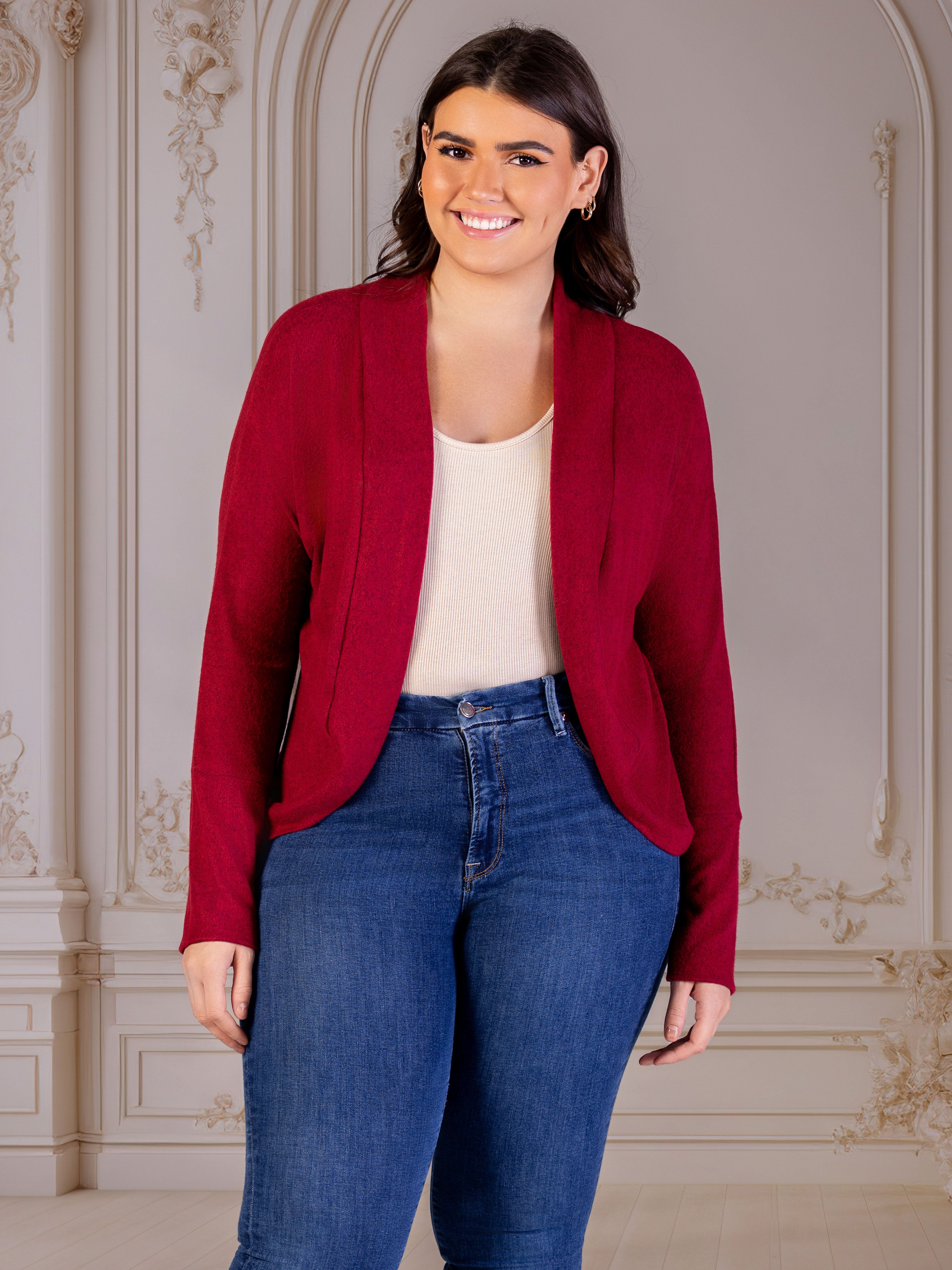 Add a refined finishing layer with this plus size bolero shrug from 24seven Comfort Apparel, designed to blend elegance and everyday comfort. The open front silhouette and softly curved hem create a flattering drape over dresses or casual looks, while the cozy fabric feels gentle on the skin. Machine washable and tumble dry for easy care. Style it over sleeveless tops or evening dresses for polished layering.