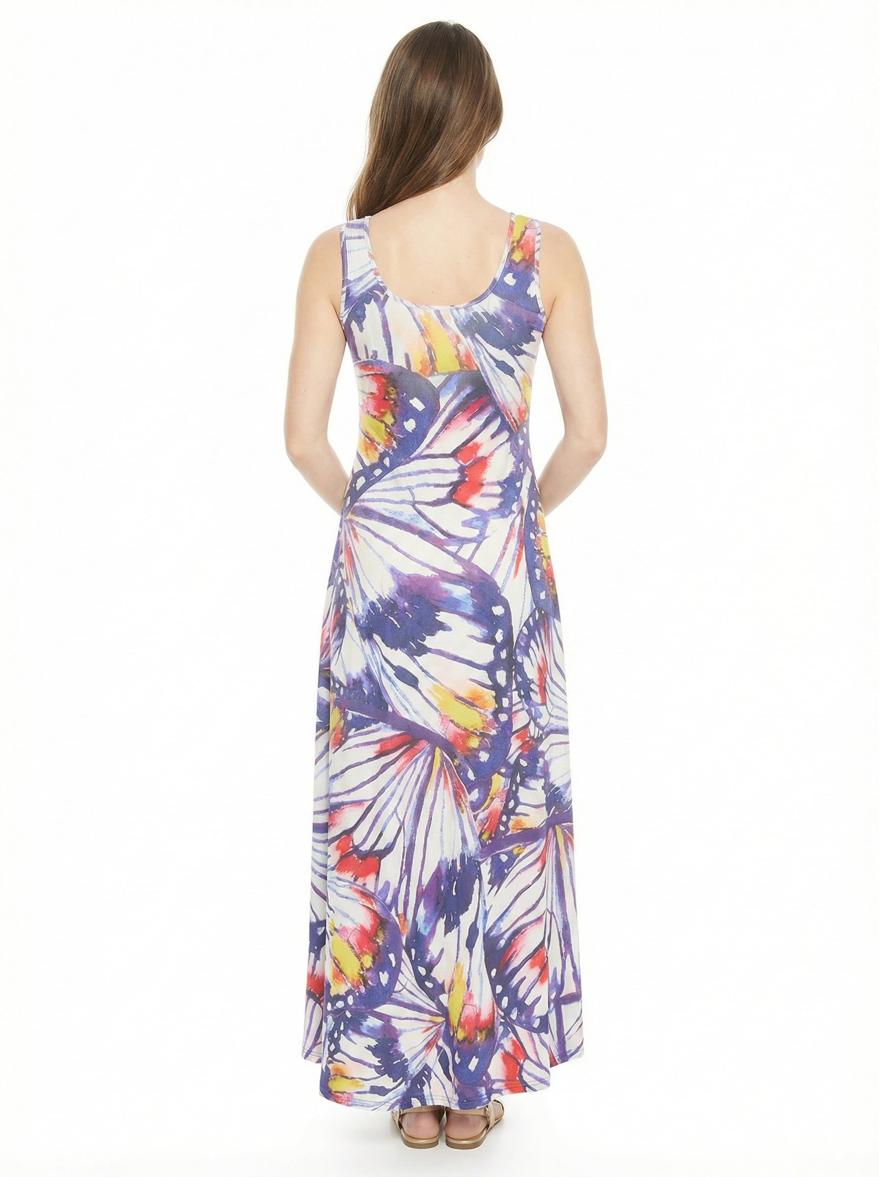 Both comfortable and stylish, this 24seven Comfort Apparel maternity white and purple oversized butterfly print sleeveless A-line tank maxi dress features a flattering scoop neckline and a flowing silhouette. Perfect for warmer months, it can be dressed up with heels or kept casual with sandals. Crafted from soft, stretchy fabric, it offers all day comfort and effortless wear. machine washable for easy care.