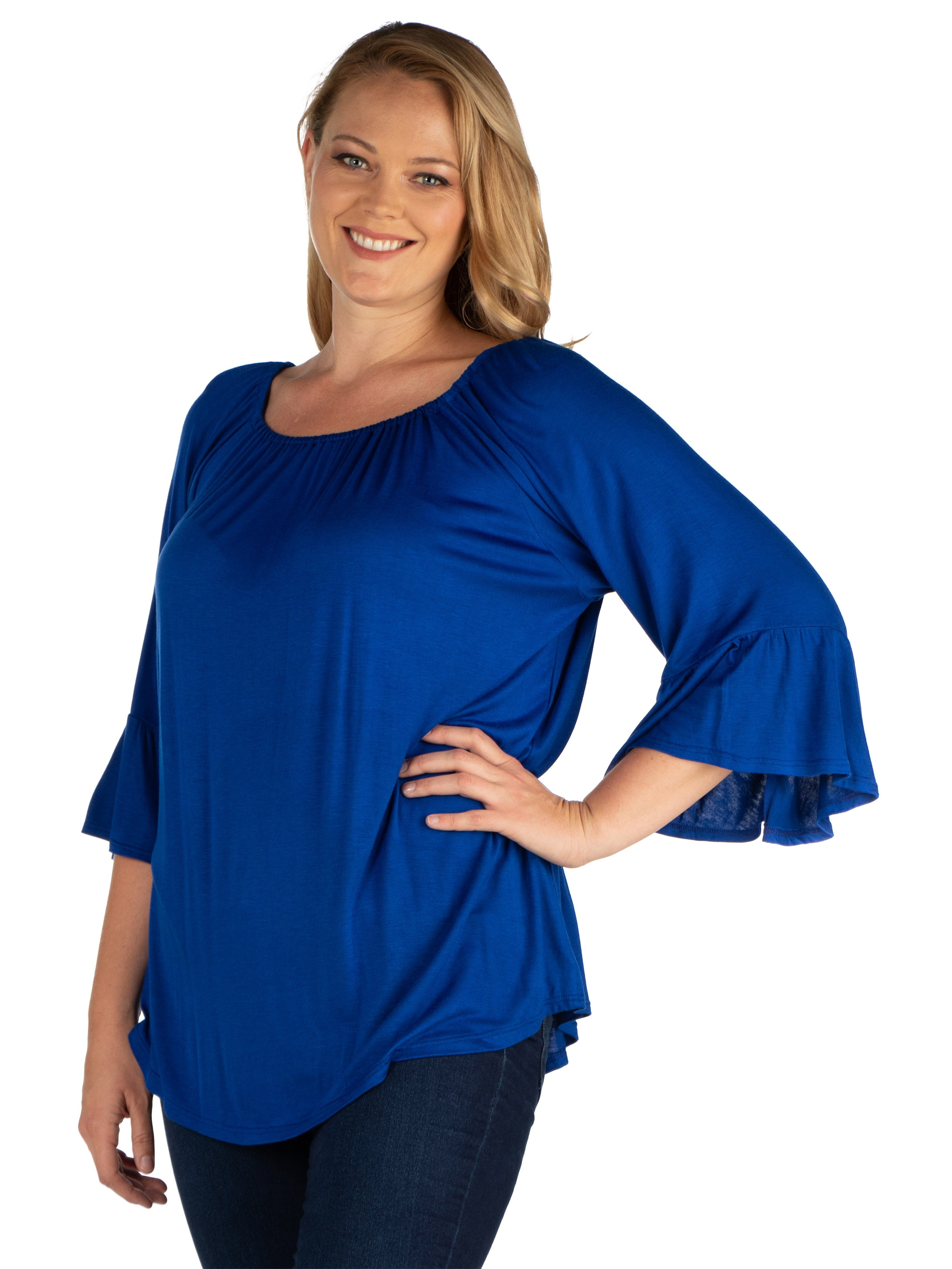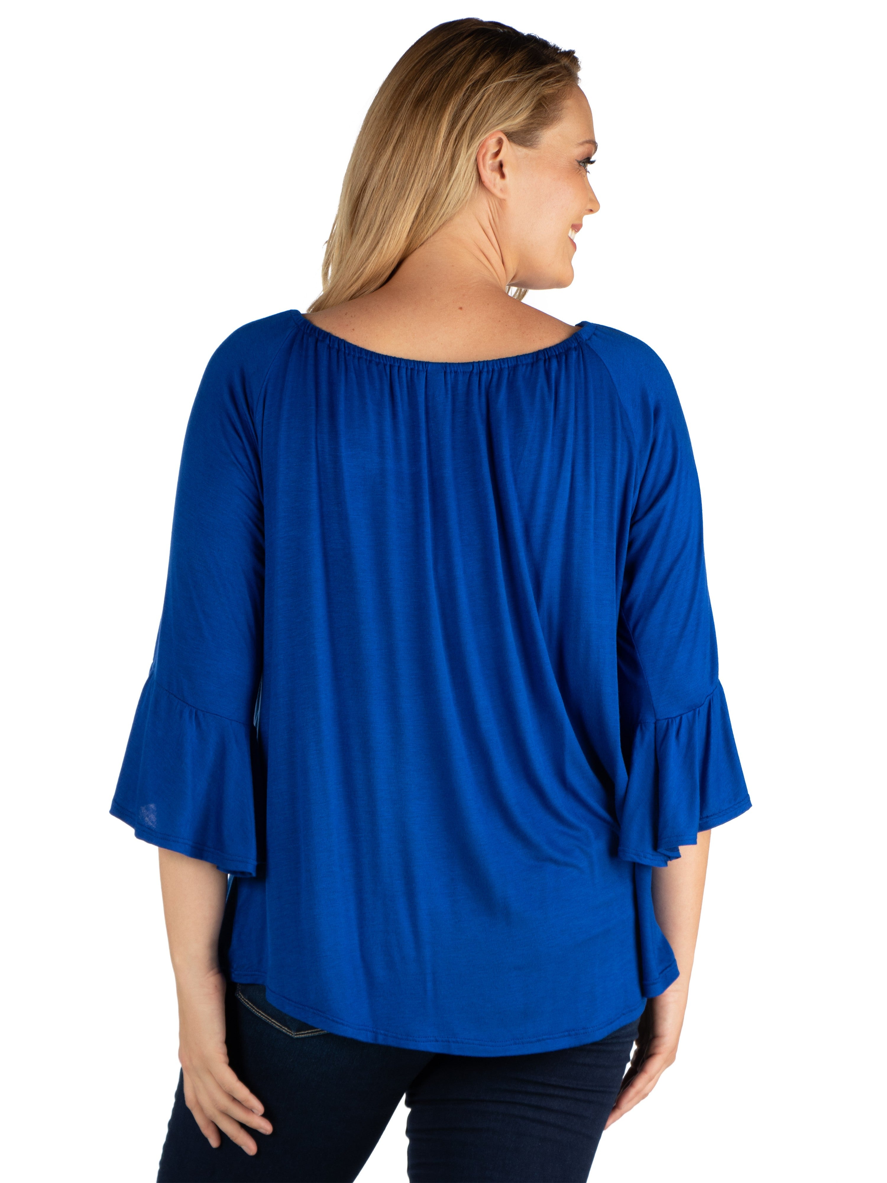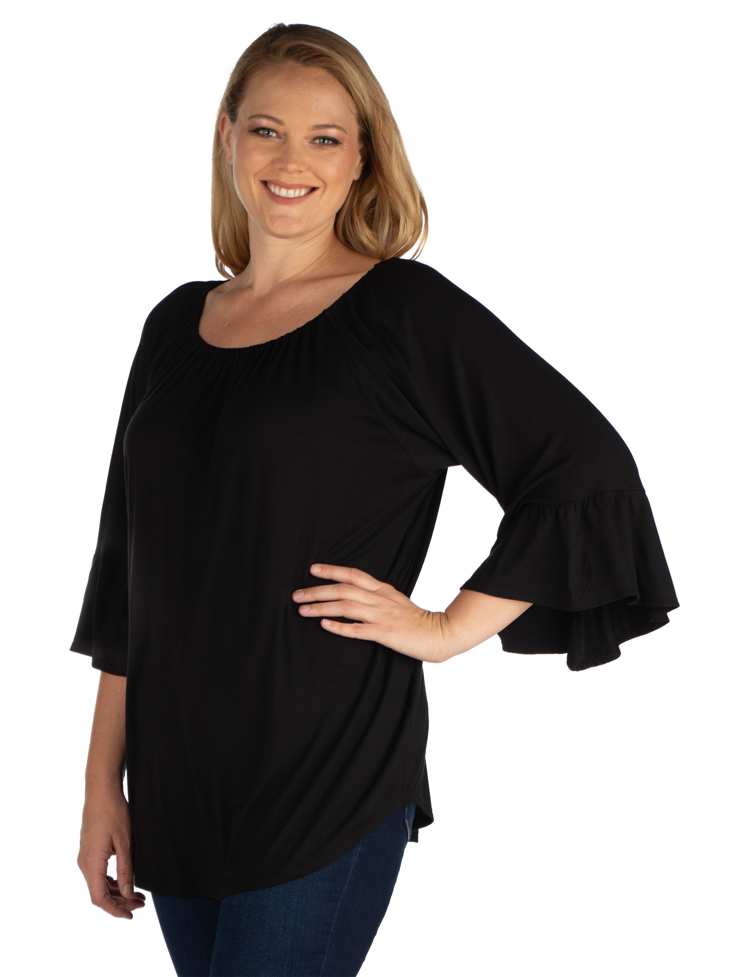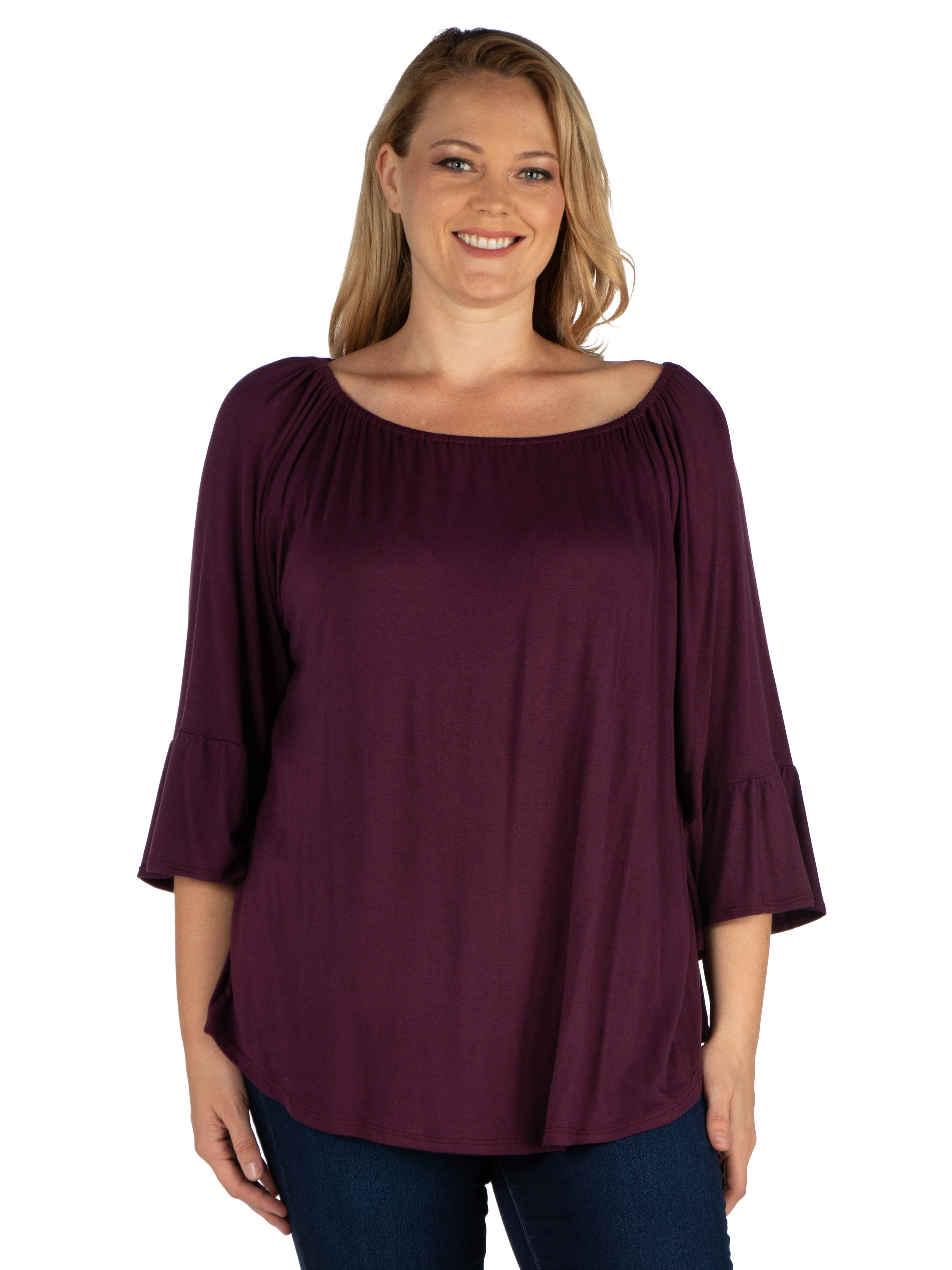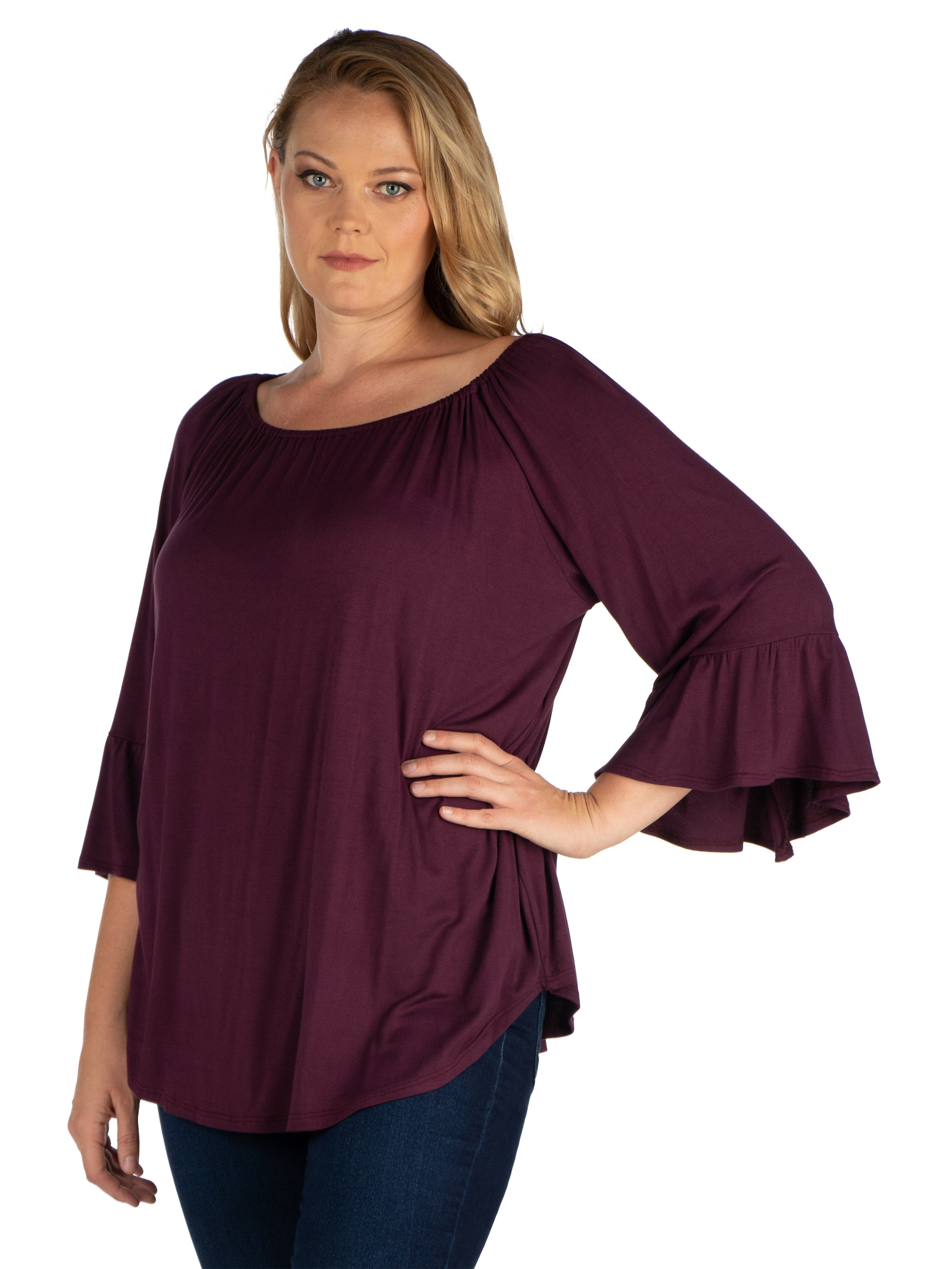 24seven Comfort Apparel brings effortless versatility to this plus size tunic, perfect for shifting from casual to dressy. The elastic neckline can be worn as a scoop or an off the shoulder style, while long flared bell sleeves and a loose rounded hem create easy movement. The soft fabric is machine washable and tumble dry, and it pairs beautifully with jeans or sleek leggings.