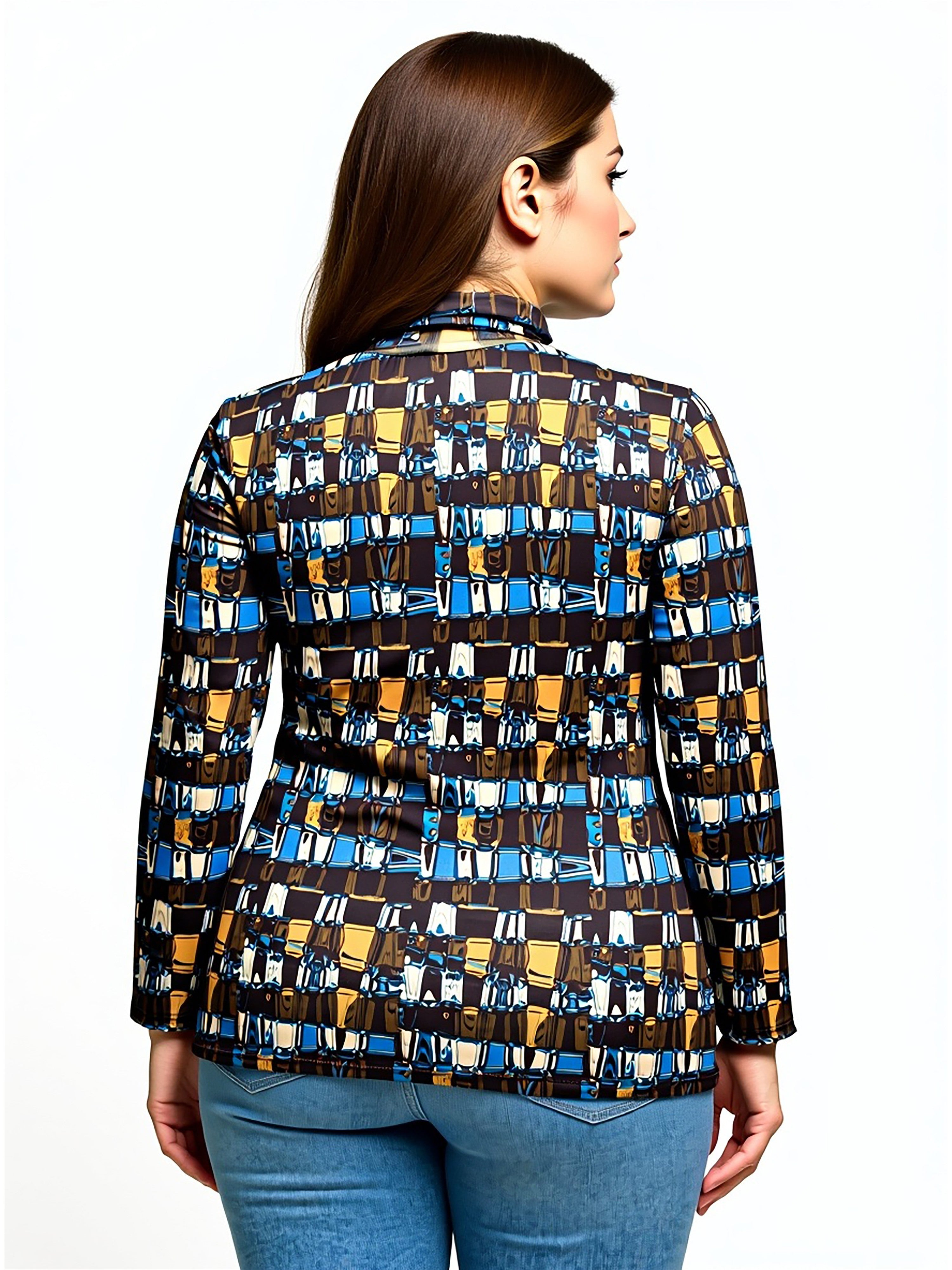 Add a modern edge to your wardrobe with this chic mock neck plus size printed top from 24seven Comfort Apparel. Featuring long sleeves and a striking geometric pattern in blue, brown, and gold, the fitted silhouette combines sophistication with everyday ease. Perfect with jeans, skirts, or tailored pants, machine washable and tumble dry for easy care.