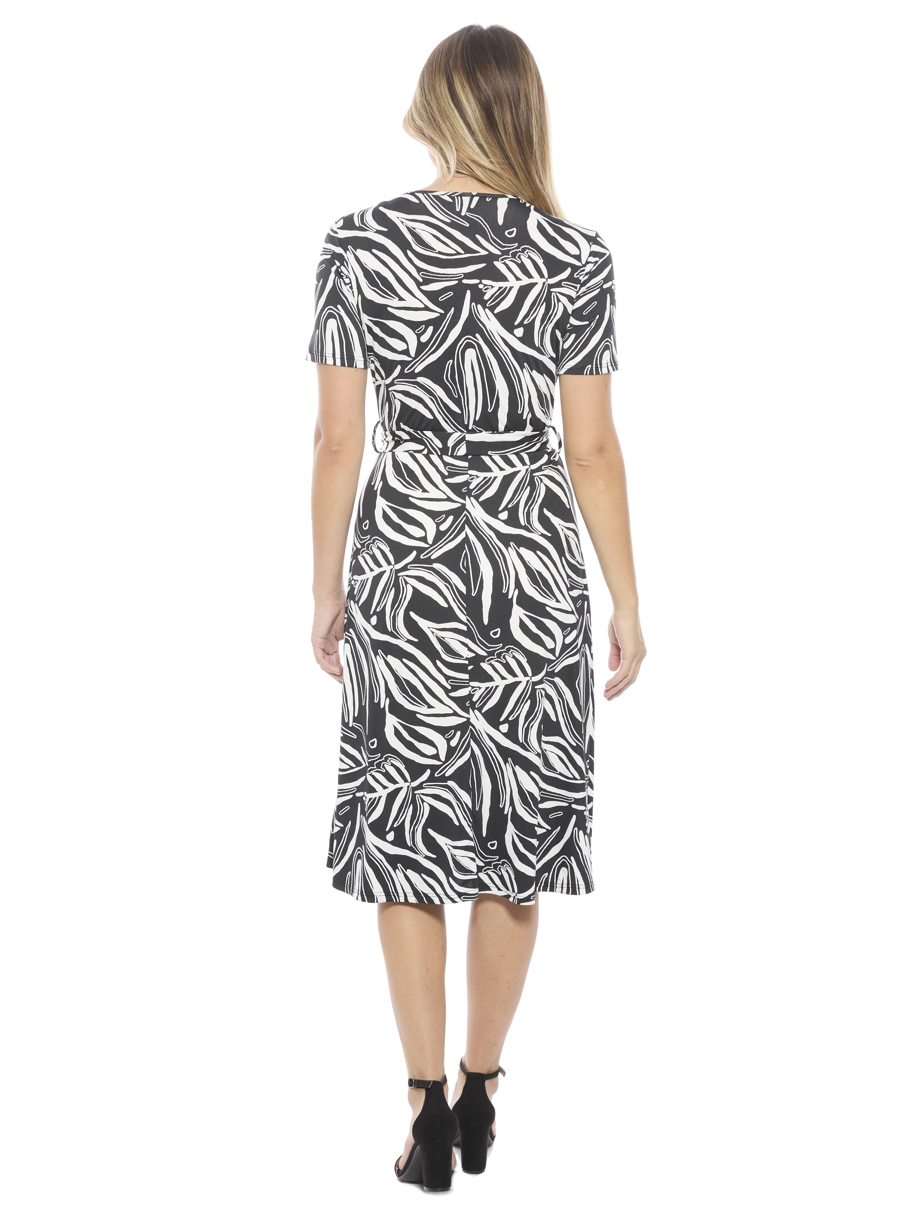 Add a refined touch to your wardrobe with this black abstract print V neck short sleeve tie waist A line midi dress from 24seven Comfort Apparel. The adjustable waist enhances the timeless silhouette, while the vibrant geometric pattern adds modern appeal. Pair with heels or flats for work or weekend plans, machine washable and tumble dry for easy care.