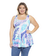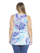 Add a playful pop to your casual wardrobe with this 24seven Comfort Apparel plus size tank top featuring a vibrant blue abstract print. The scoop neckline, sleeveless design, and flared below hip fit create a relaxed, flattering silhouette, while soft lightweight fabric keeps you comfortable all day. Machine washable, and perfect for layering or wearing on its own with ease.