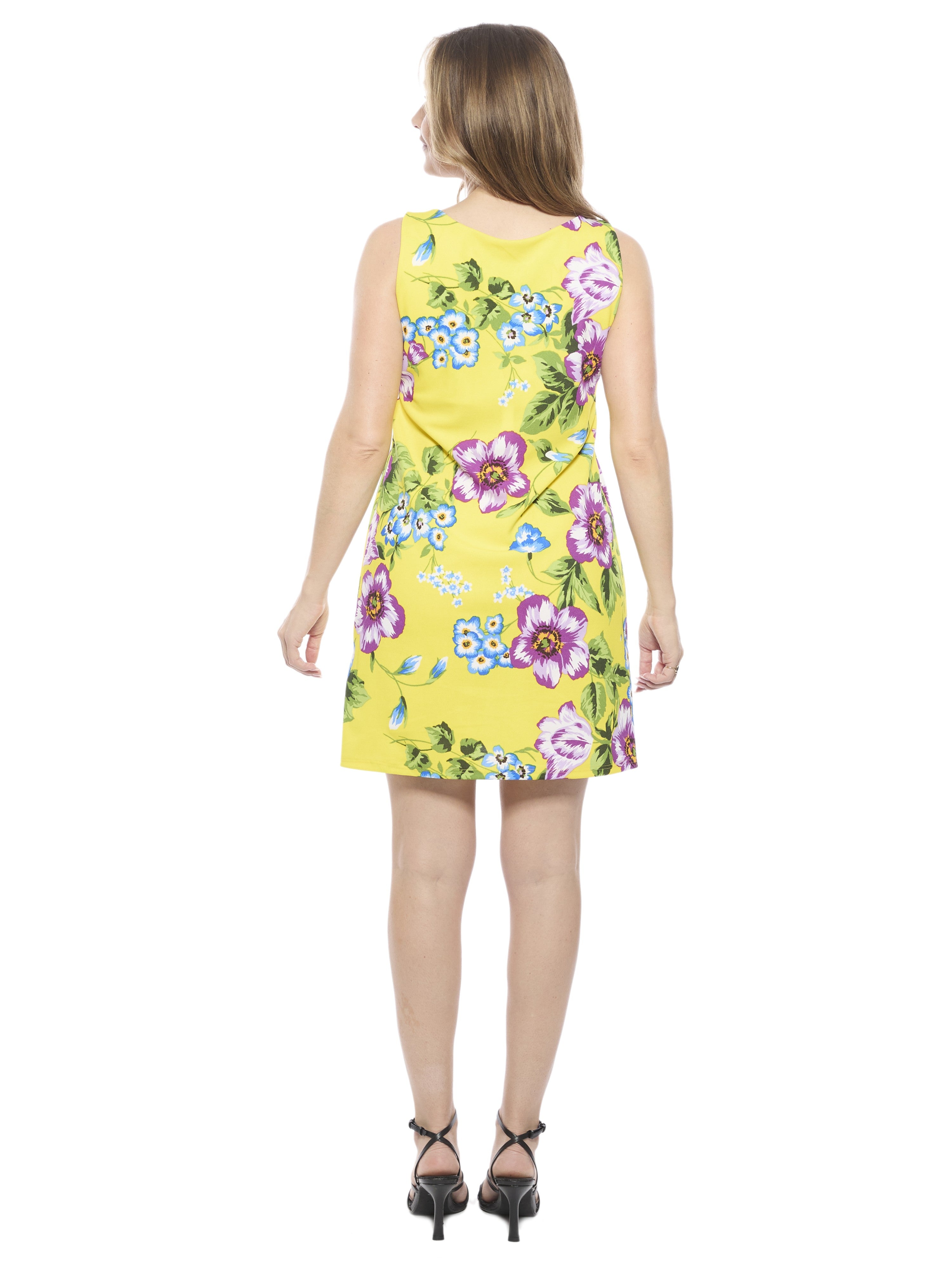 Stay effortlessly chic in this yellow floral print sleeveless mini shift dress from 24seven Comfort Apparel. Designed with a classic round neckline and a relaxed, flattering fit, this timeless piece combines comfort and style. The soft, slightly textured stretch fabric offers a structured drape that holds its shape beautifully. Perfect for casual days or brunch outings. Machine washable and tumble dry for easy care.